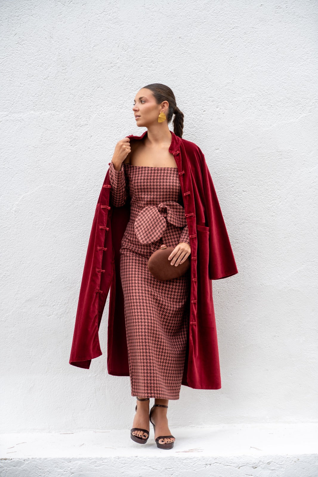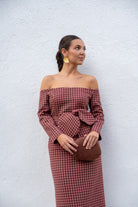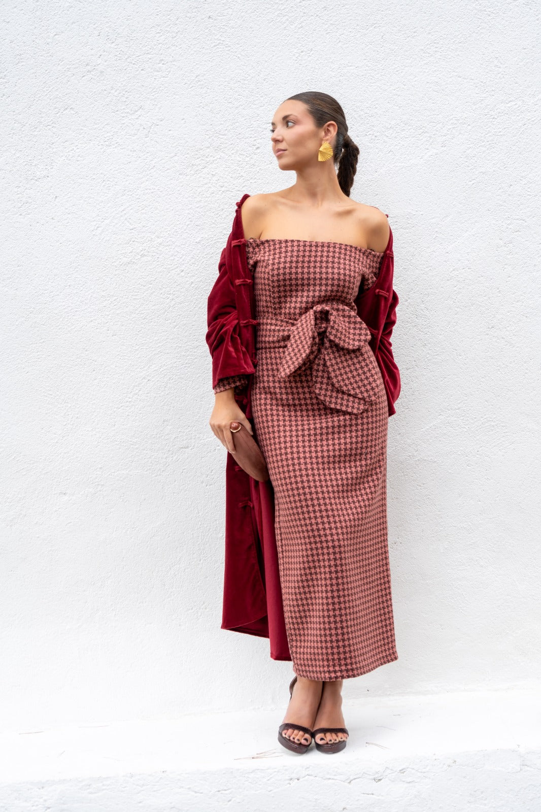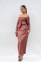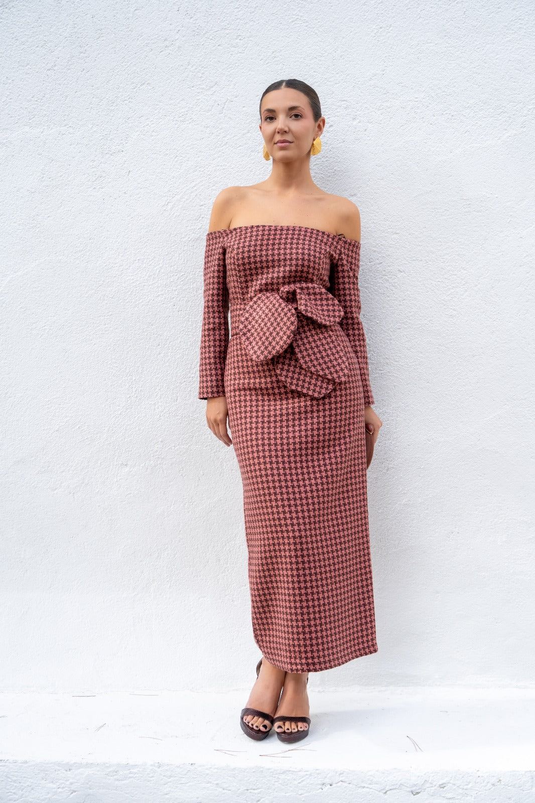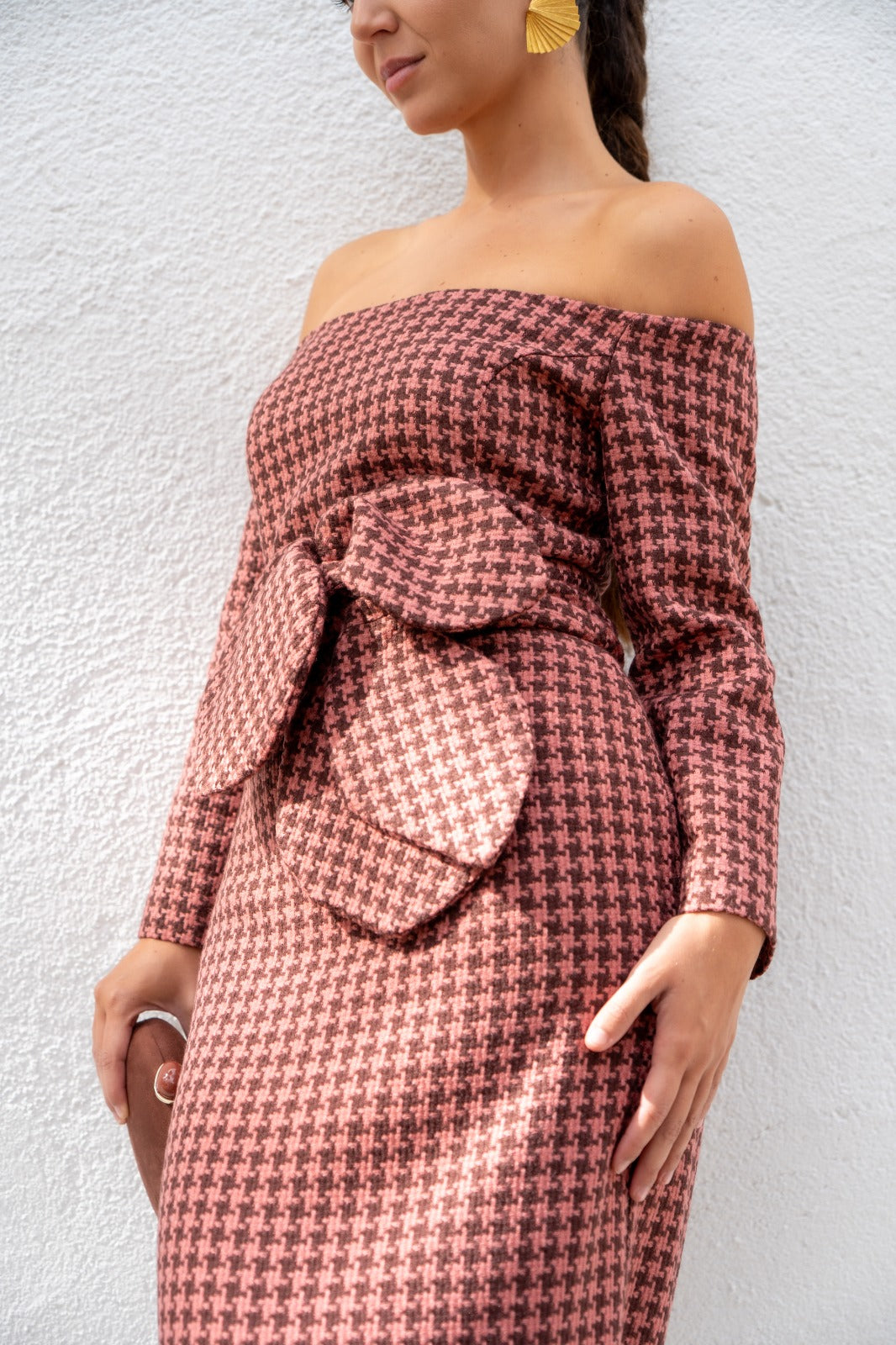 Vestido midi, escote Bardot, manga francesa, abertura trasera, cinturón extraíble. En cuadro vichy  marrón y rosa.