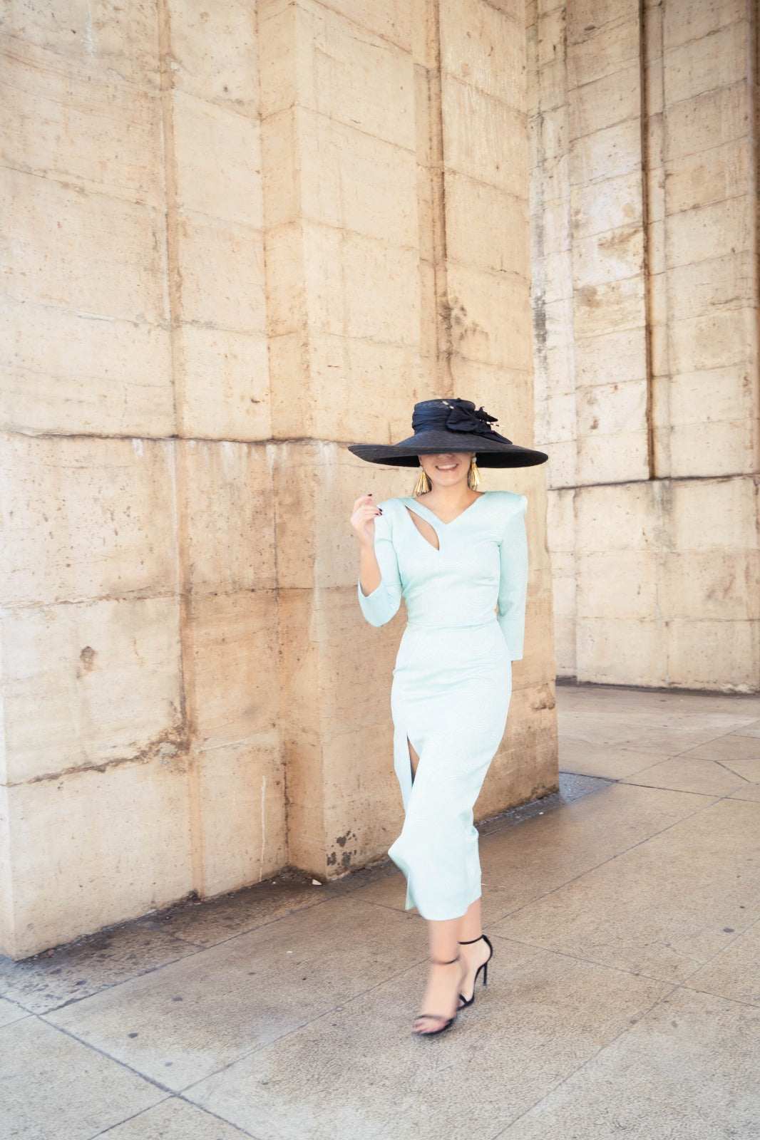 Vestido midi, escote a pico y pequeña abertura a un lado, manga francesa, abertura delantera a un lado. En color verde con dibujo y detalla en lurex plata.