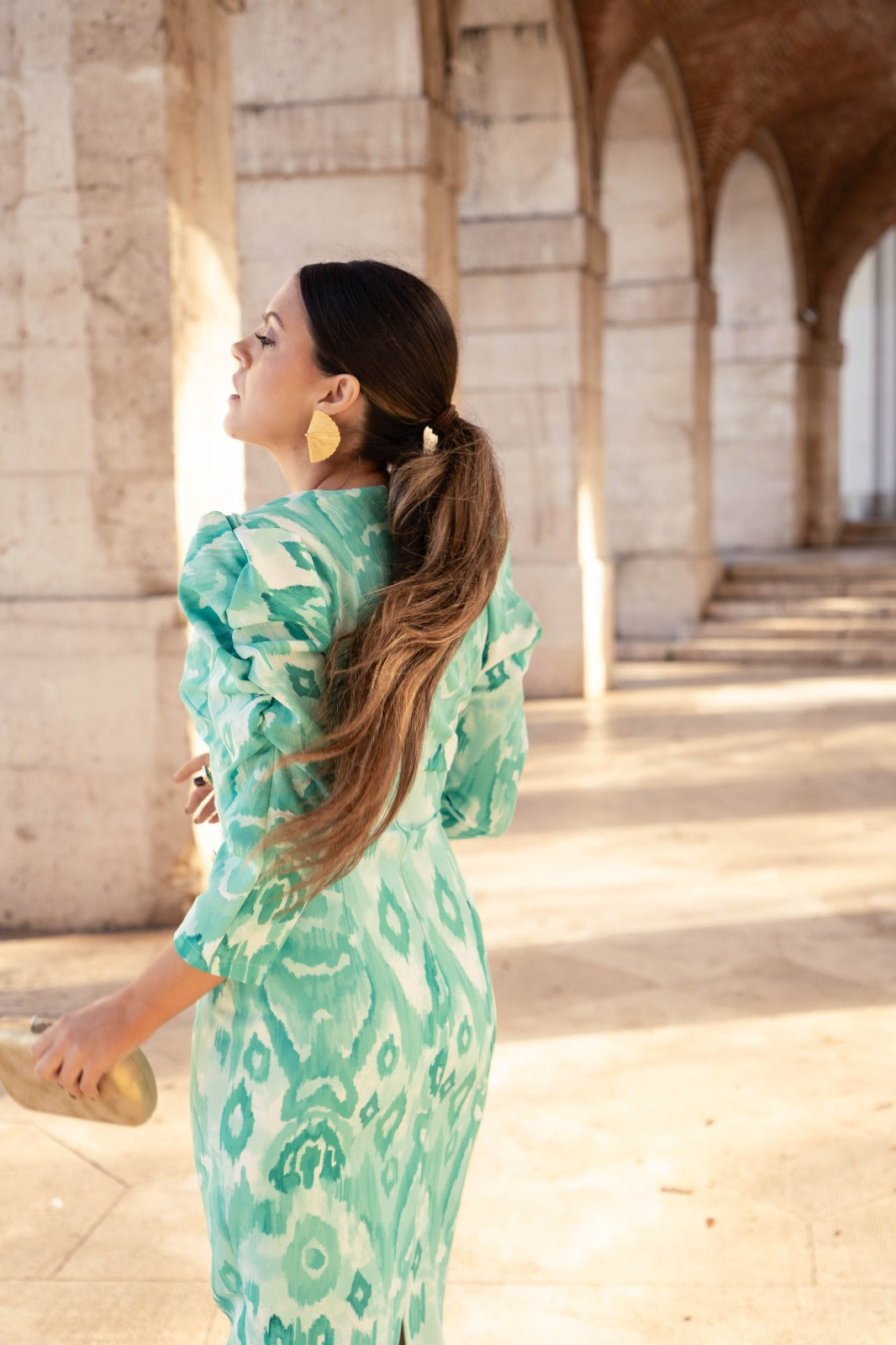 Vestido midi, escote cruzado, manga francesa, fruncido delantero y detalla botones dorados, abertura trasera. En color verde con estampado.