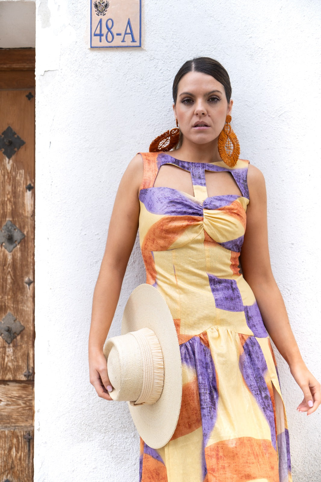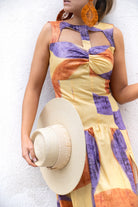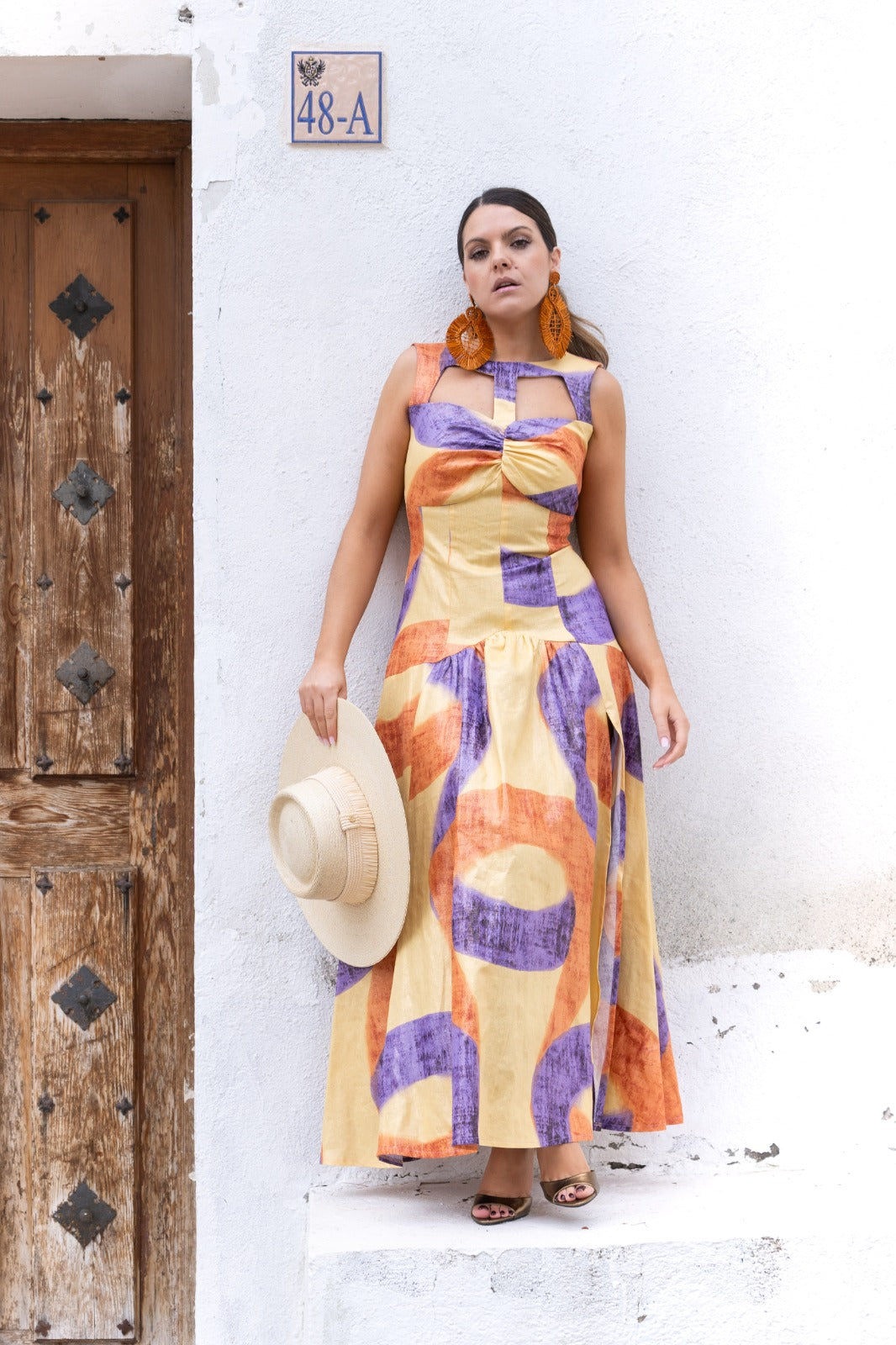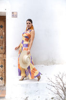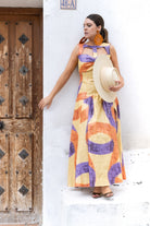 Vestido largo, escote redondo con detalles descubiertos, sin mangas, falda con vuelo. Estampado en varios colores.