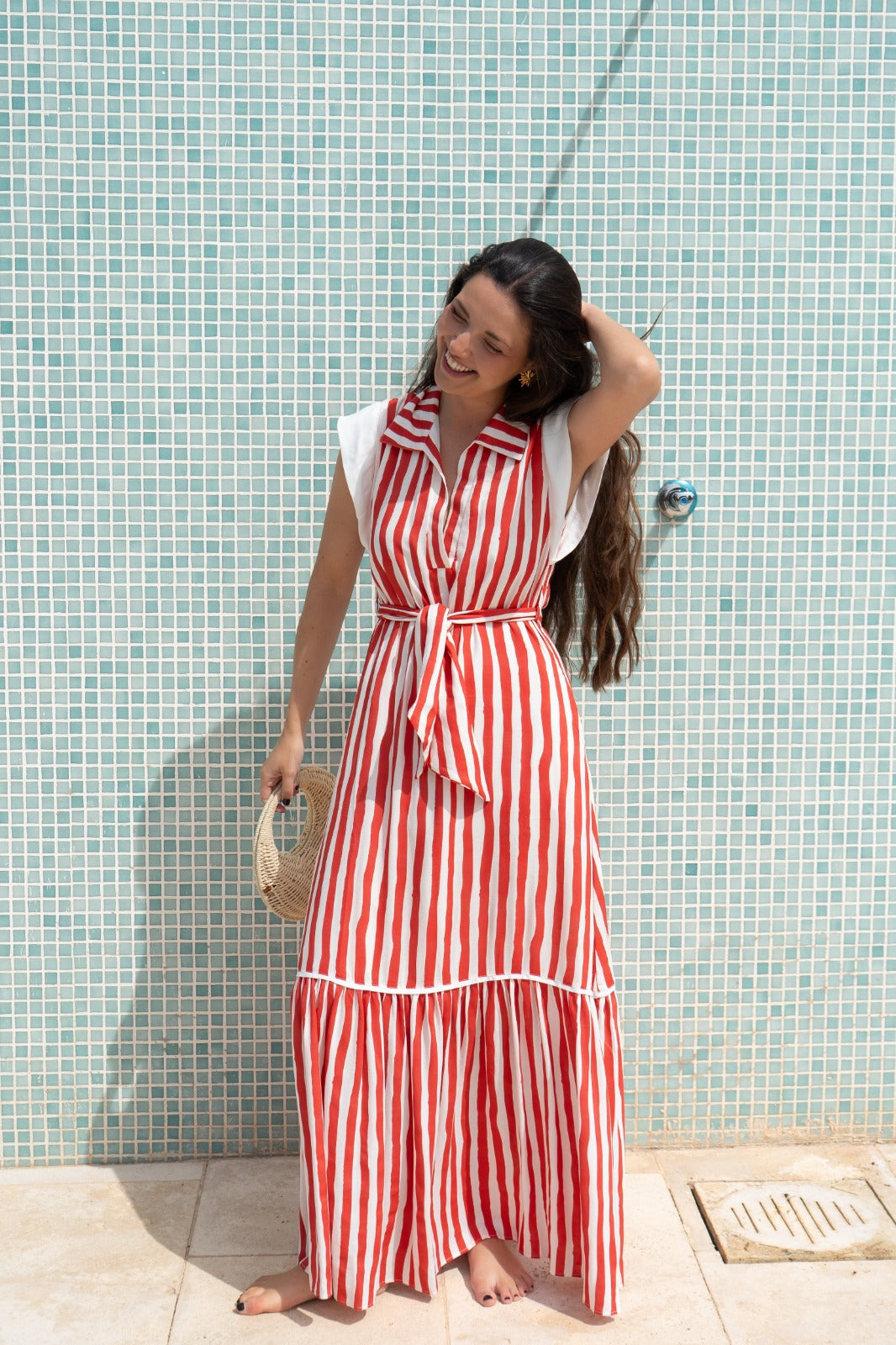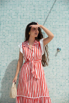 Vestido largo, escote camisero, sin mangas, volante abajo, cinturon para anudar. En rayas rojo y blanco.