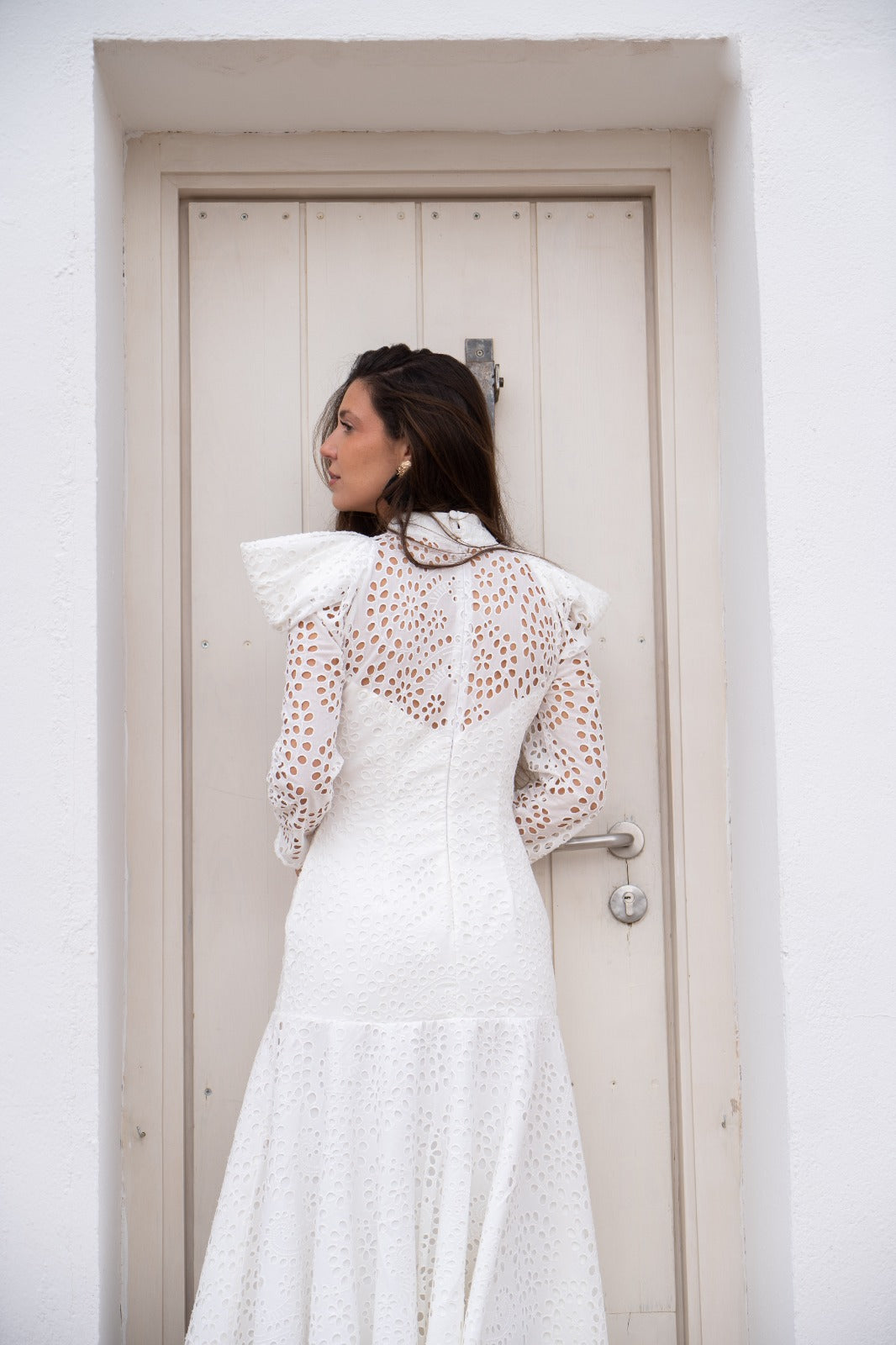 Vestido maxi midi, cuello subido, manga larga, con volante abajo. En color blanco, tejido calado.