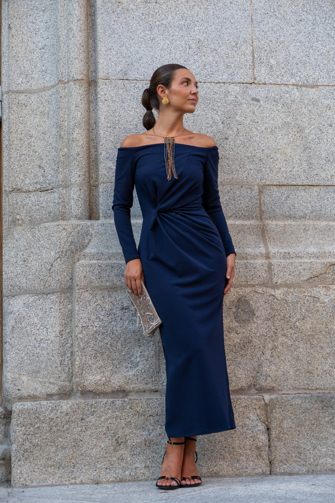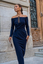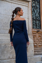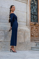 Vestido midi, escote barco, manga francesa, con nudo en cintura a un lado. En color azul.
