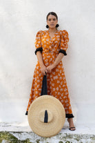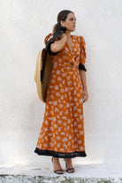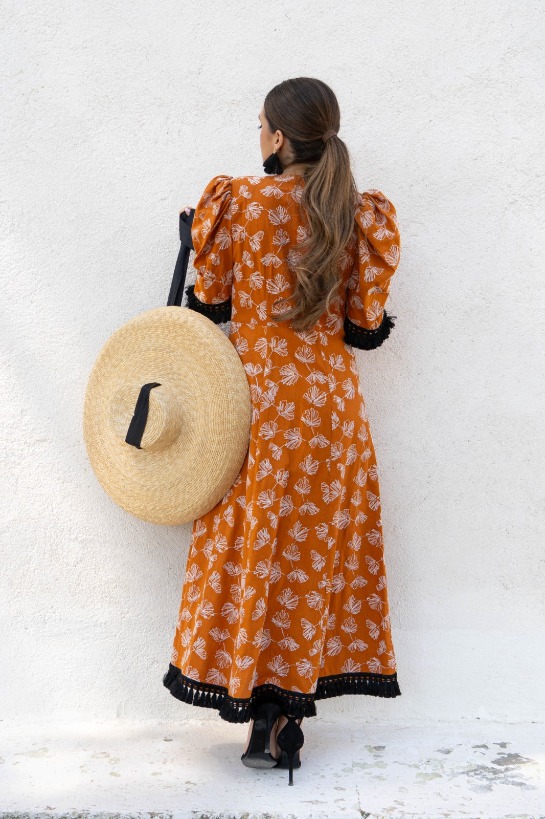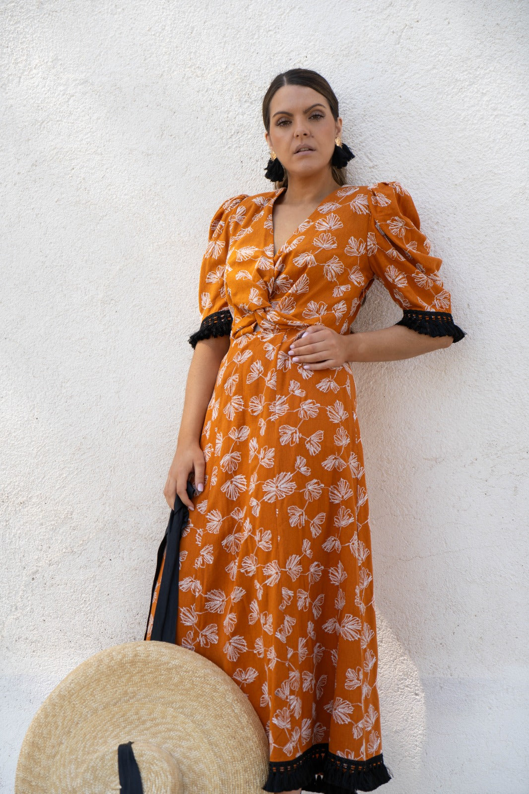 Vestido midi, escote a pico terminado en nudo, manga corta abullonada, detalle flecos negros en el bajo. En color caldera con estampado en hilo blanco.