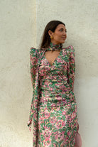Vestido midi, escote a pico, manga larga hombrera alta, fruncido en el pecho, lazo para el cuello. En flores estampadas.