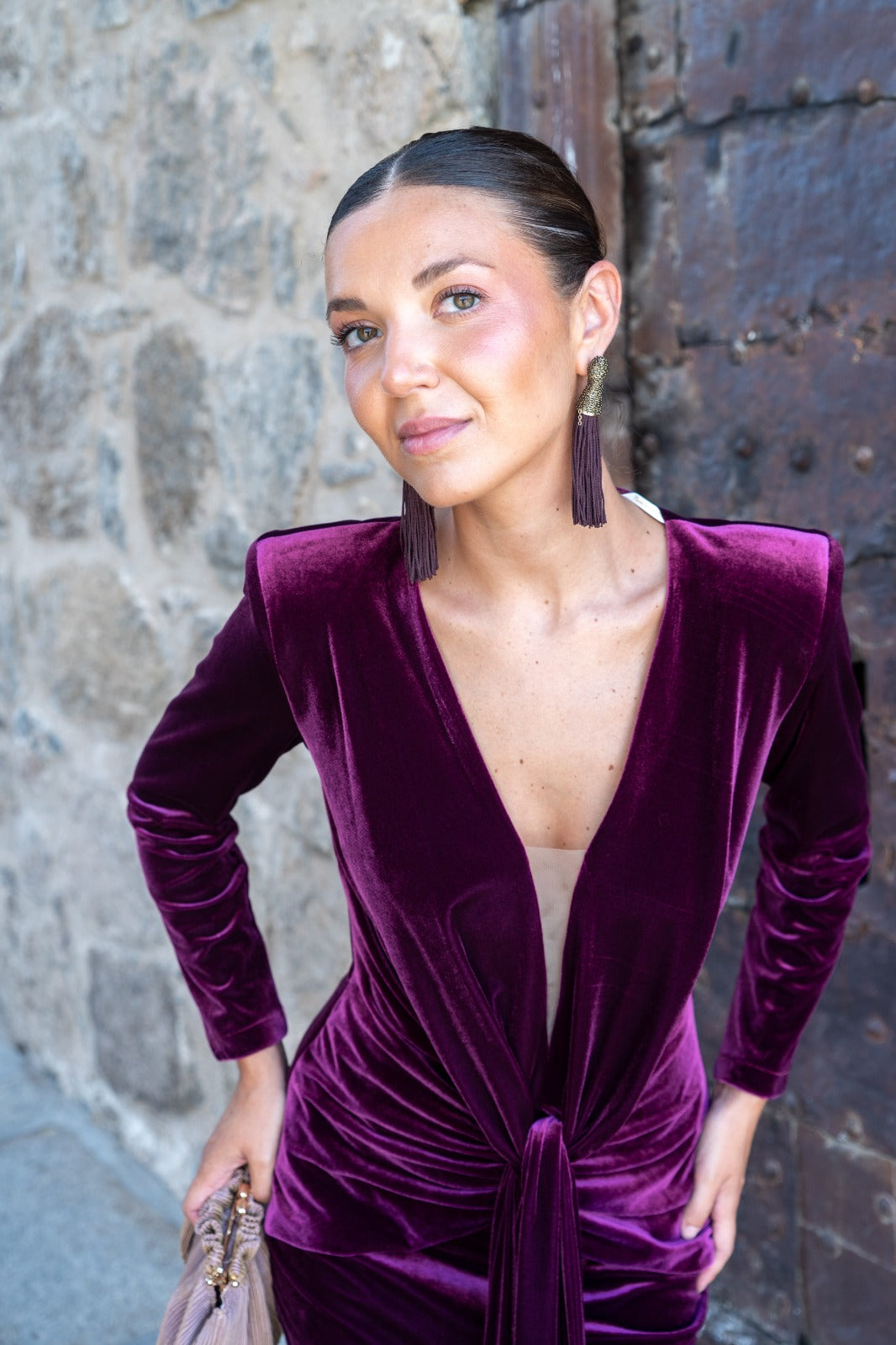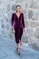 Vestido midi, escote a pico con tela transparente, manga larga, nudo en cintura, abertura delantera. En terciopelo burdeos. Ideal para combinar con nuestra capa ZAMIA.