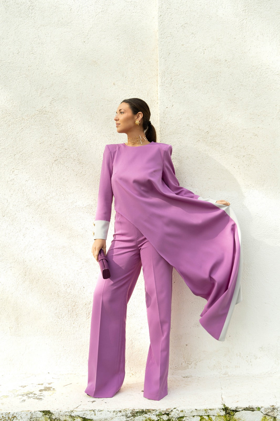 Conjunto bicolor, formado por dos piezas: Top asimétrico con hombreras ochenteras y capa lateral. Puños a contraste con detalle de botones dorados. La espalda también lleva como detalle los mismos botones, y todo ello irá combinado con un pantalón Palazzo del mismo tono que la parte delantera del top.