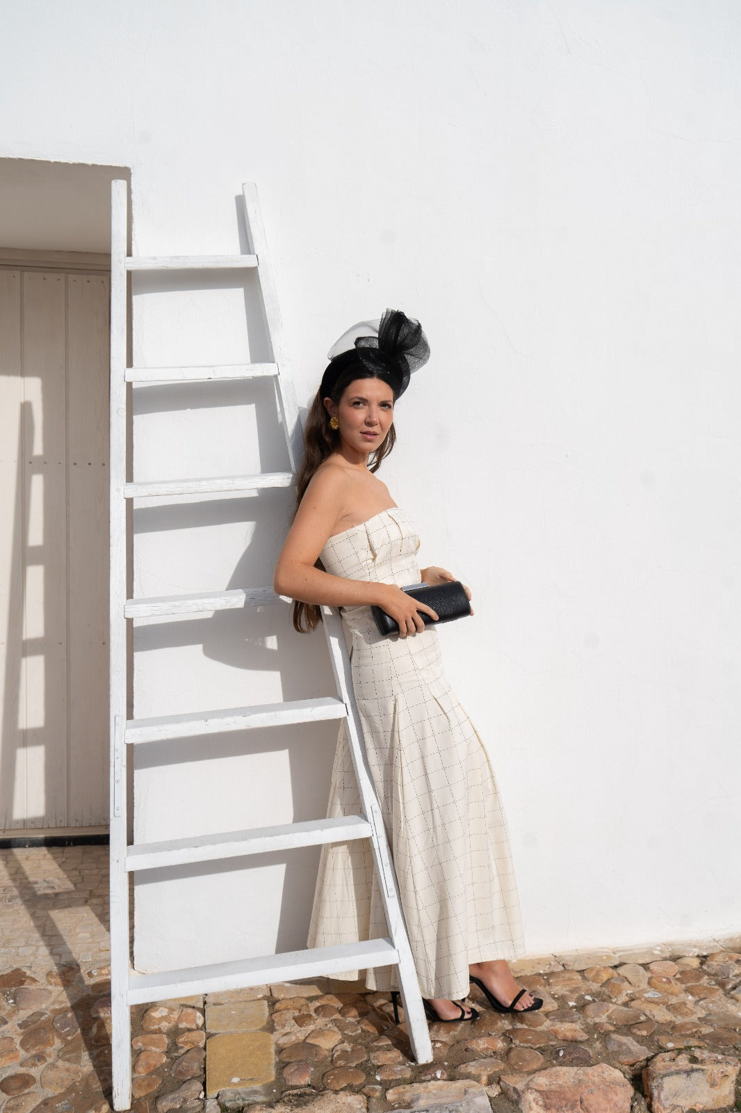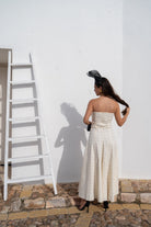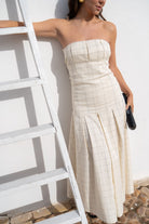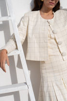 Vestido midi palabra de honor, falda de corte midi acampanado y chaqueta manga larga corte recto, botones frontales. En color beige detalles cuadros.