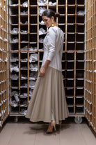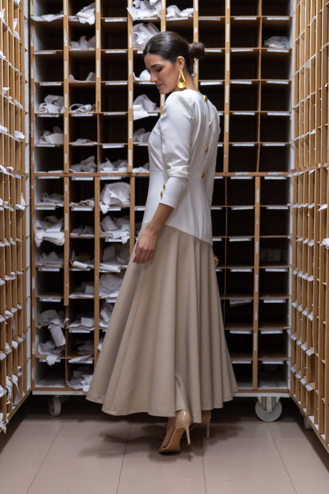 Vestido midi, escote redondo, manga francesa, detalles botones dorado traseros y puños, falda con movimiento. Bicolor blanco y beige.