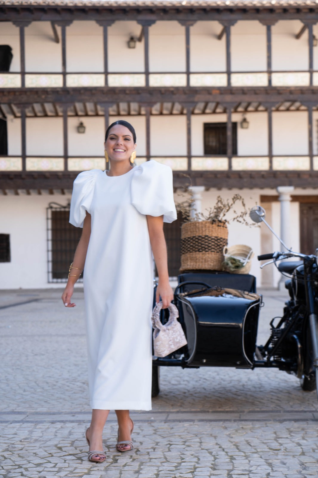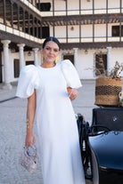 Vestido midi, escote redondo, maxi manga corta, espalda con detalle botones dorados. En color blanco.