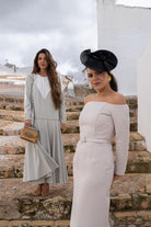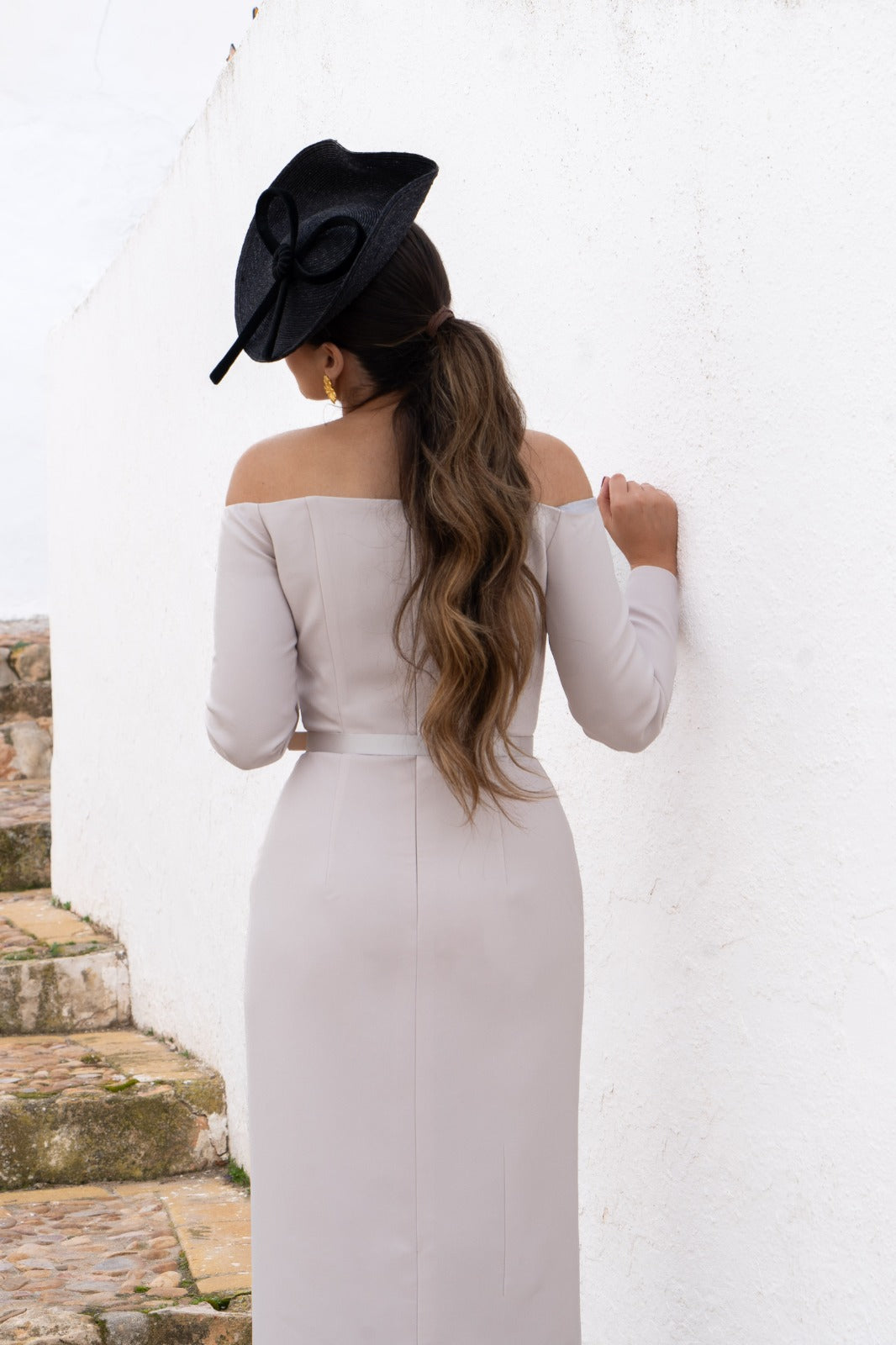 Vestido con manga larga y escote barco, dejando totalmente al descubierto los hombros. Costadillo italiano en el cuerpo y corte en la cintura con falda que termina con una pieza en la parte brillo del mismo tejido. En color gris perla.