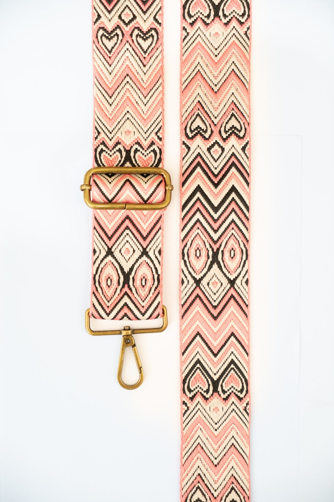 Asa bandolera étnica tejida con diferentes estampados en rosa y negro. Combinable con los bolsos Cies y Cotal.