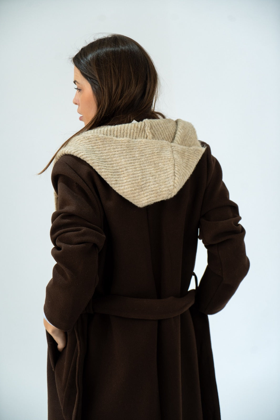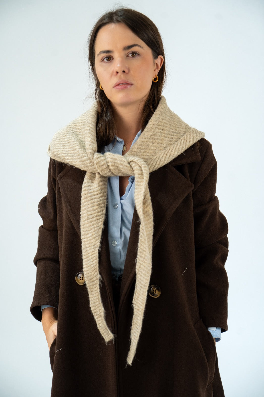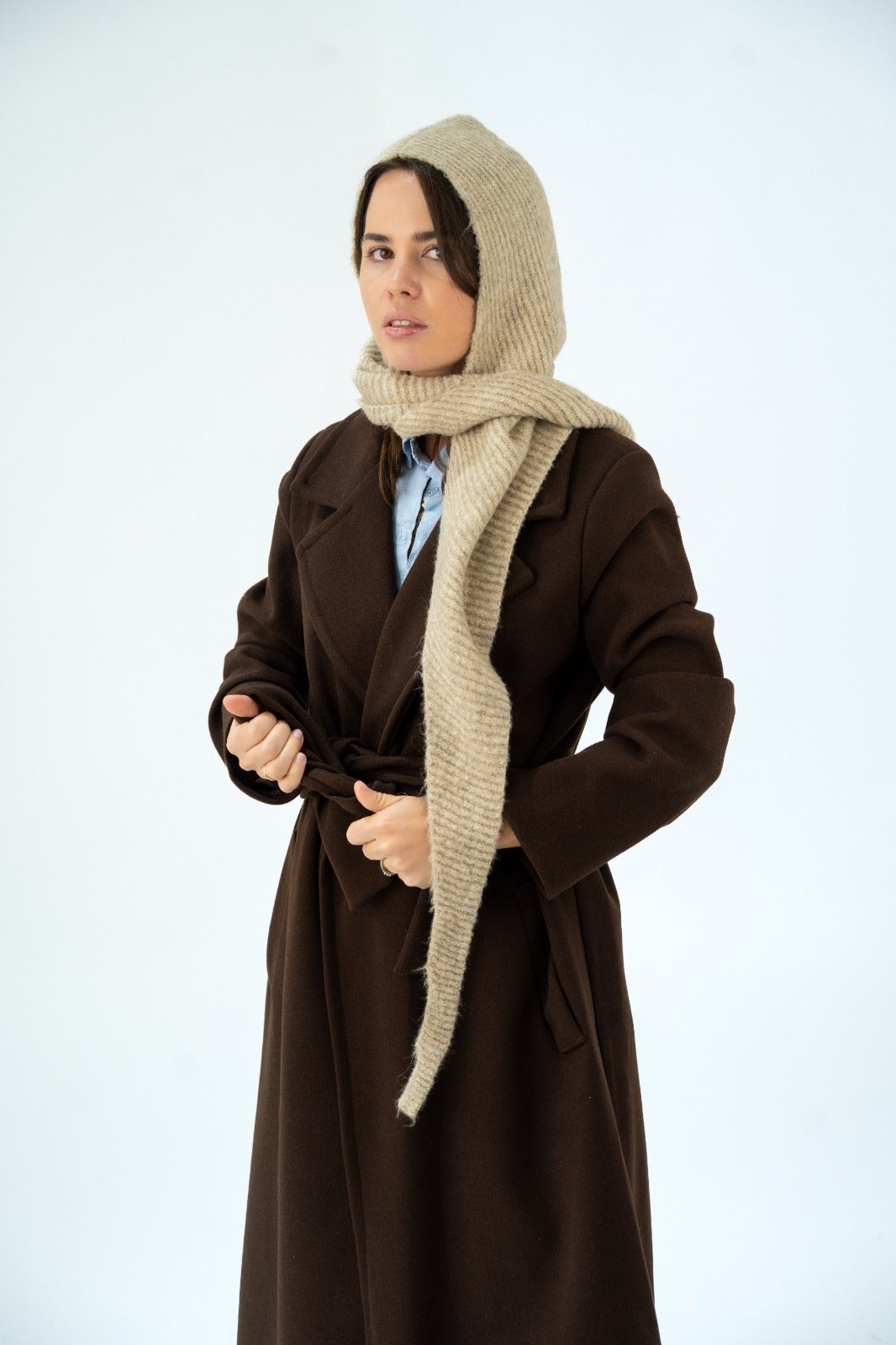Combinación de bufanda terminada en picos y capucha en lana, en color beige.