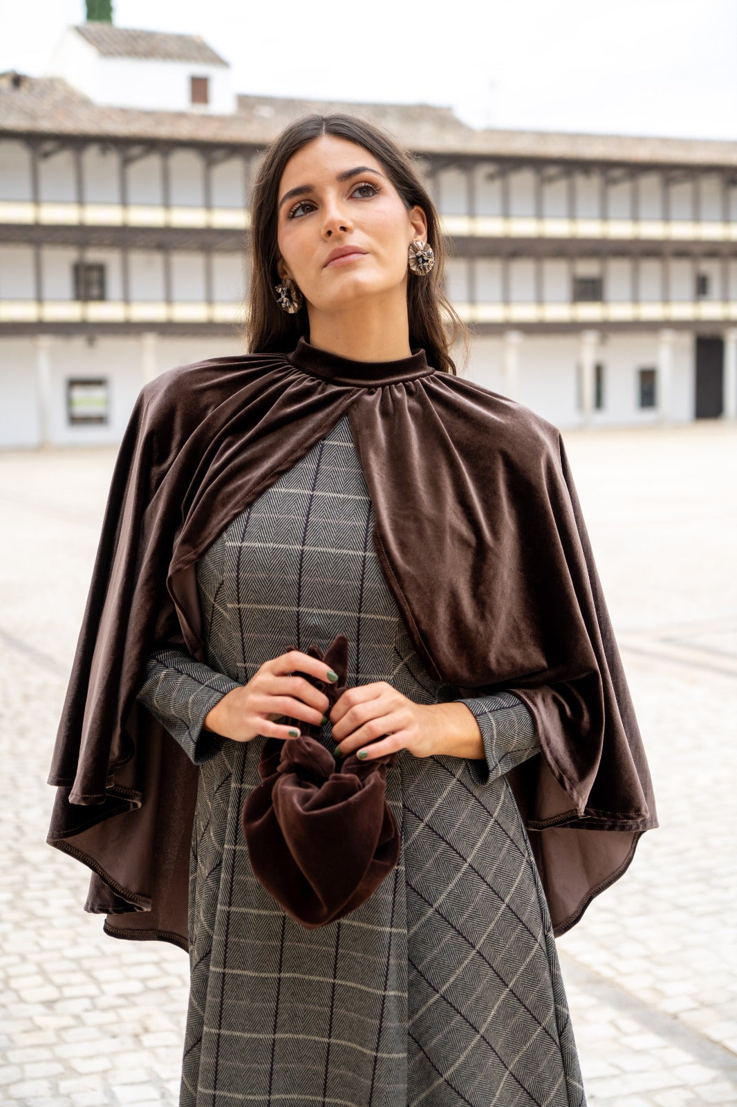 Capa corta, en terciopelo, cuello perkins, abierta en la parte delantera, cerrada por la parte trasera, abrochada con dos botones. En color marron.