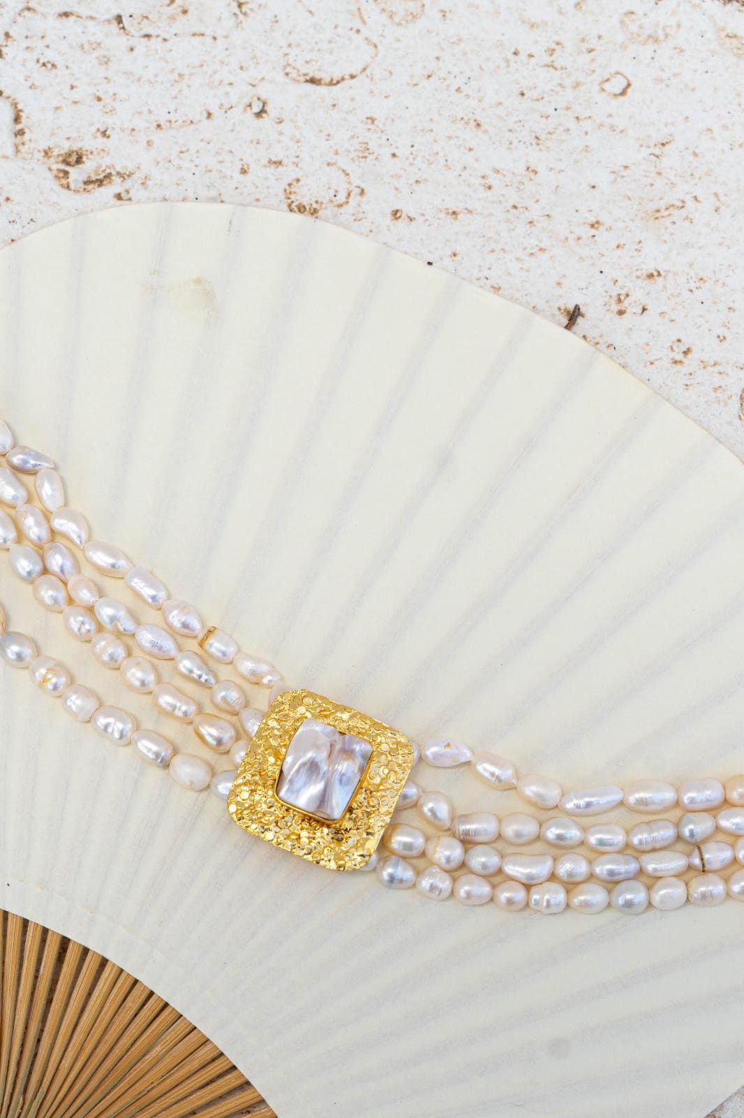 Choker formado por cuatro hileras de piedras y un cuadrado en el centro con una piedra grande, artesanal realizando pieza a pieza.