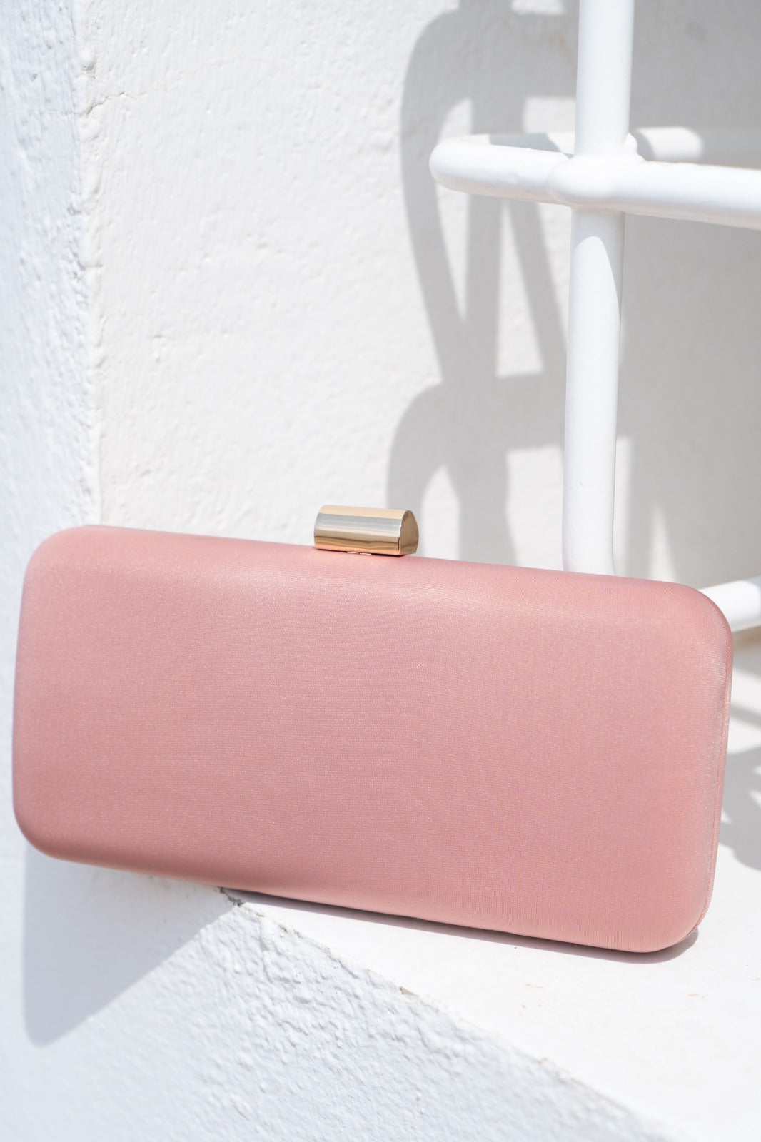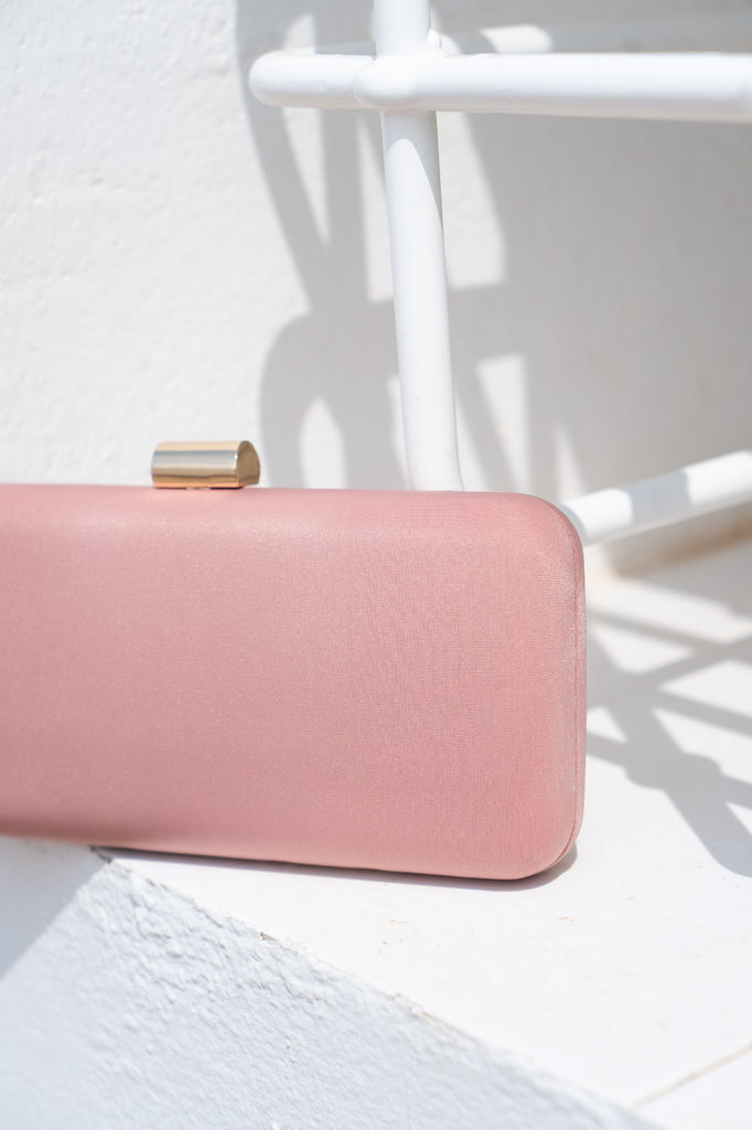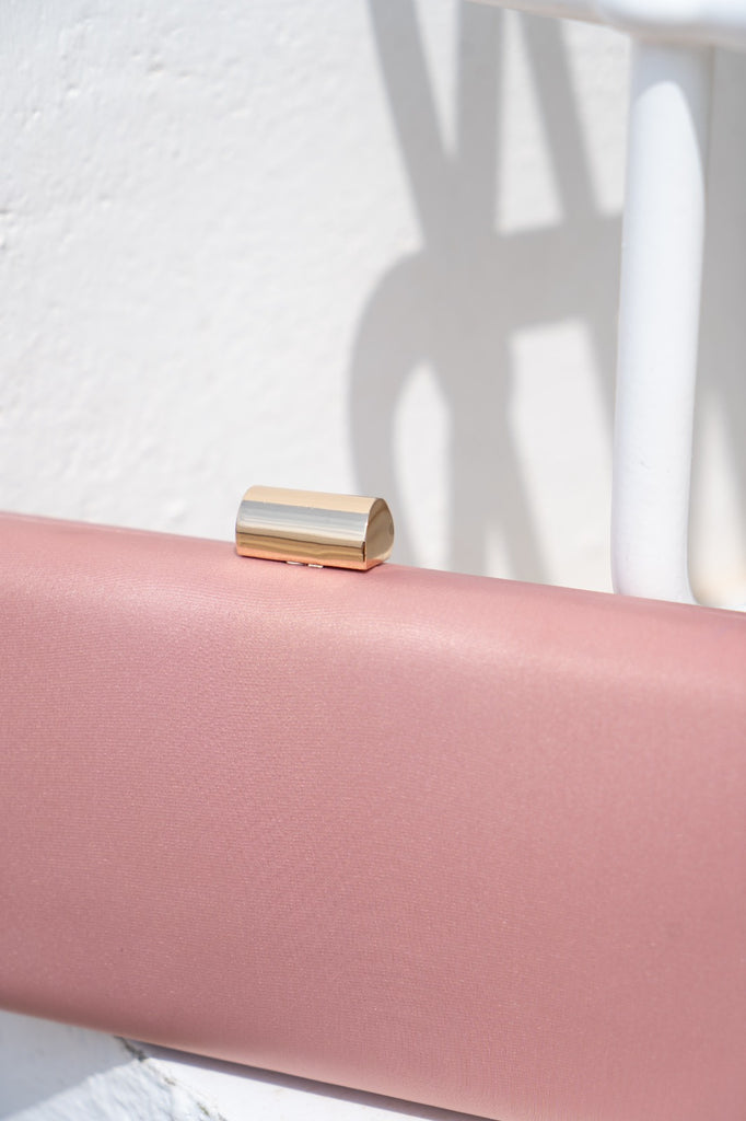 Cartera rigida, cierre con iman dorado y cadena para colgar. En color rosa.