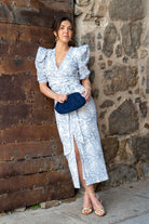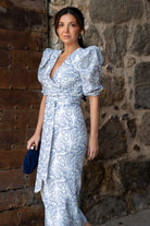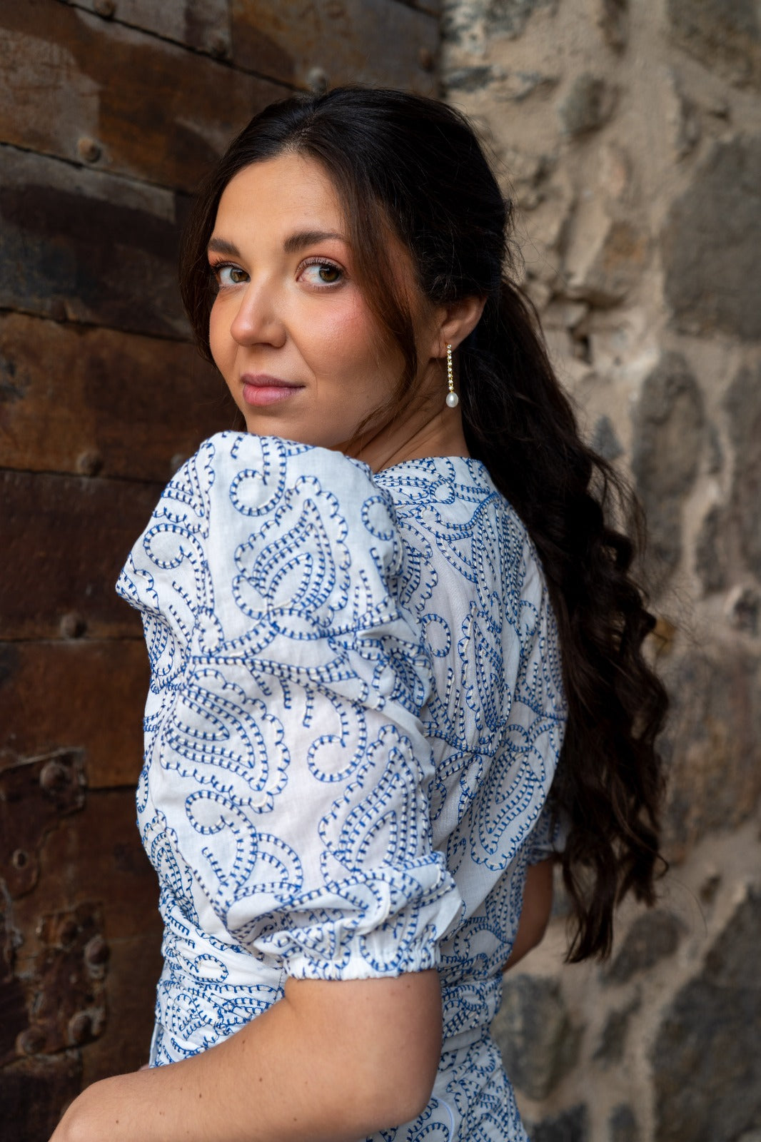 Conjunto compuesto por blusa escote a pico cruzada, manga corta abullonada y fala alta, abertura trasera. En tejido blanco con detalles azul.