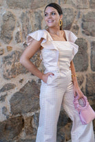 Conjunto compuesto por top corto, escote cuadrado con volante en hombros y pantalon alto, cremallera a un lado, detalle botones delanteros. En color rosa con estampado lurex.