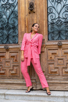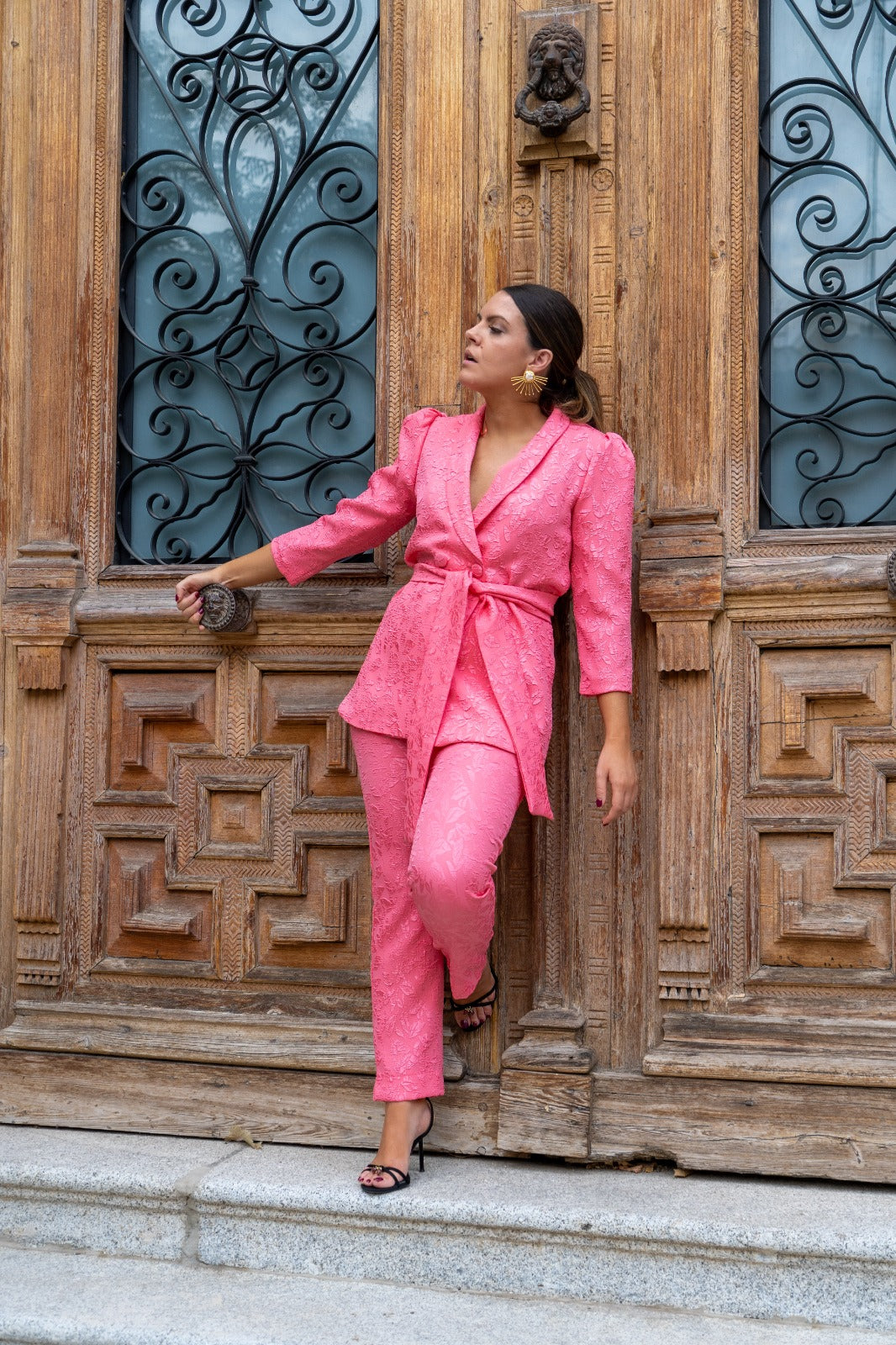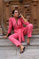Conjunto compuesto chaqueta manga francesa, abotonada en el centro, cinturón y pantalón cinturilla, cremallera trasera, recto. En color rosa con brocado.
