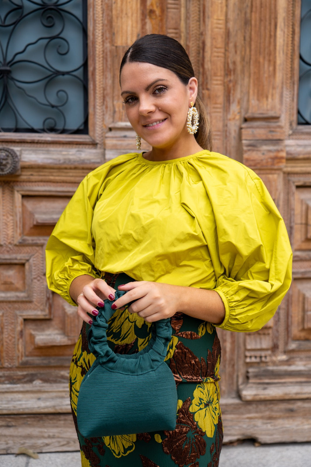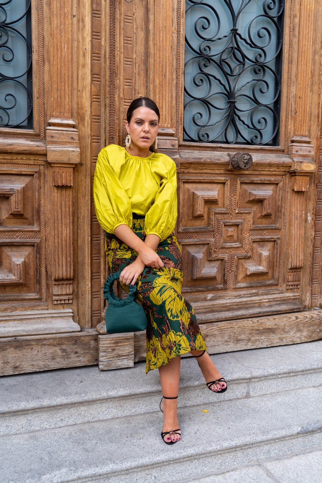 Conjunto compuesto por blusa escote redondo fruncido, mangas abullonadas y falda cintura alta, lápiz, abertura trasera, En color lima y estampados.