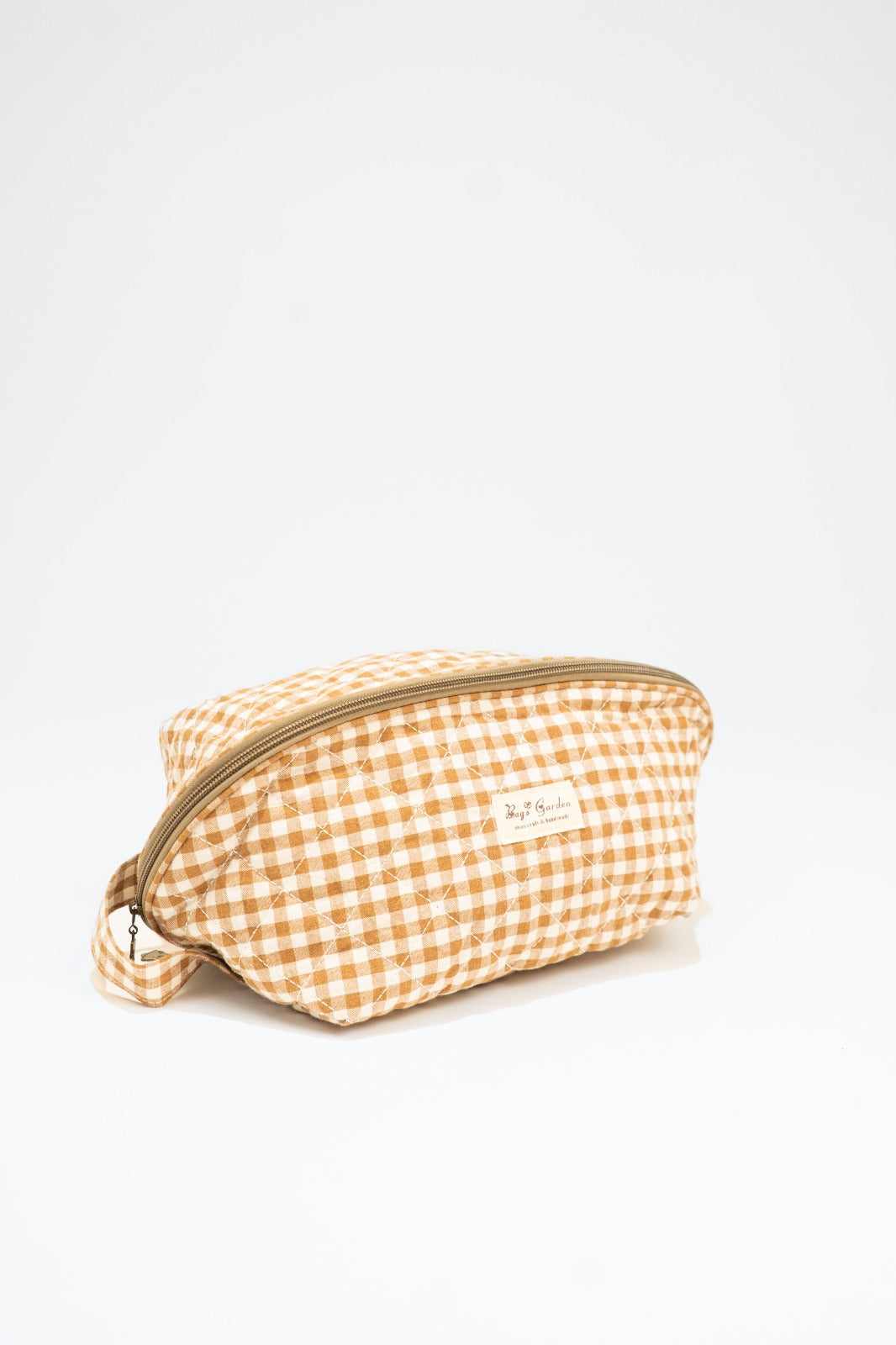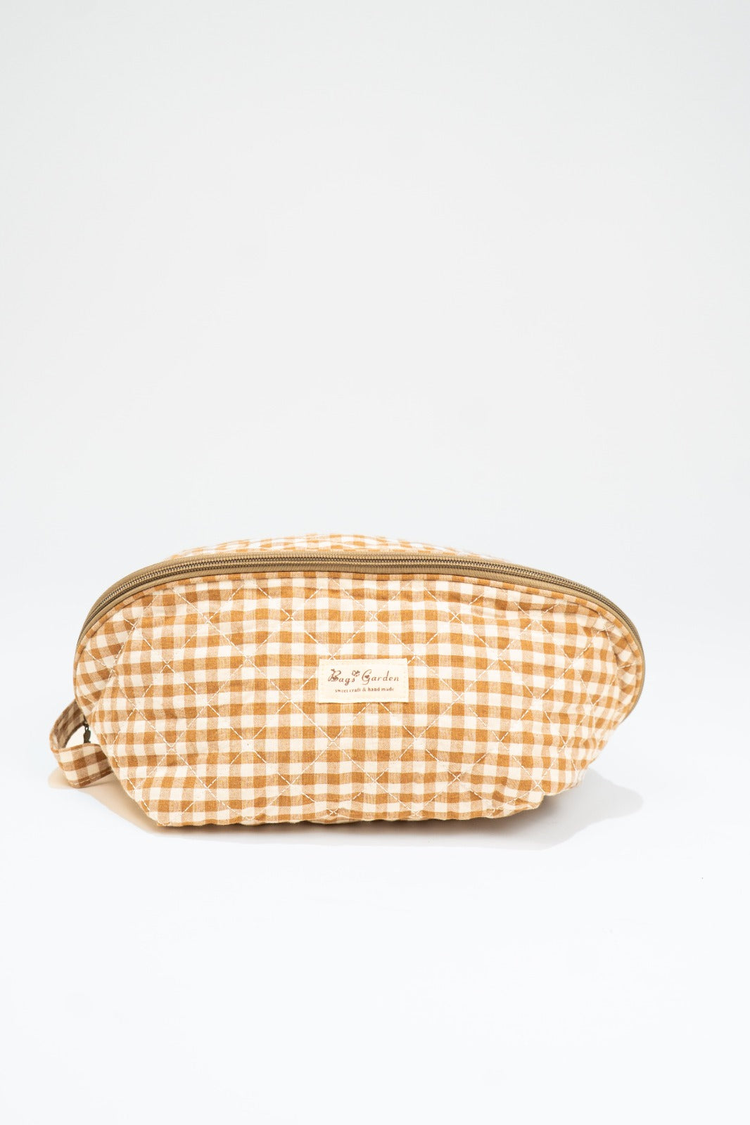 Neceser cierre con cremallera, asa en un lado, bolsillos interiores, en vichy blanco y marrón.