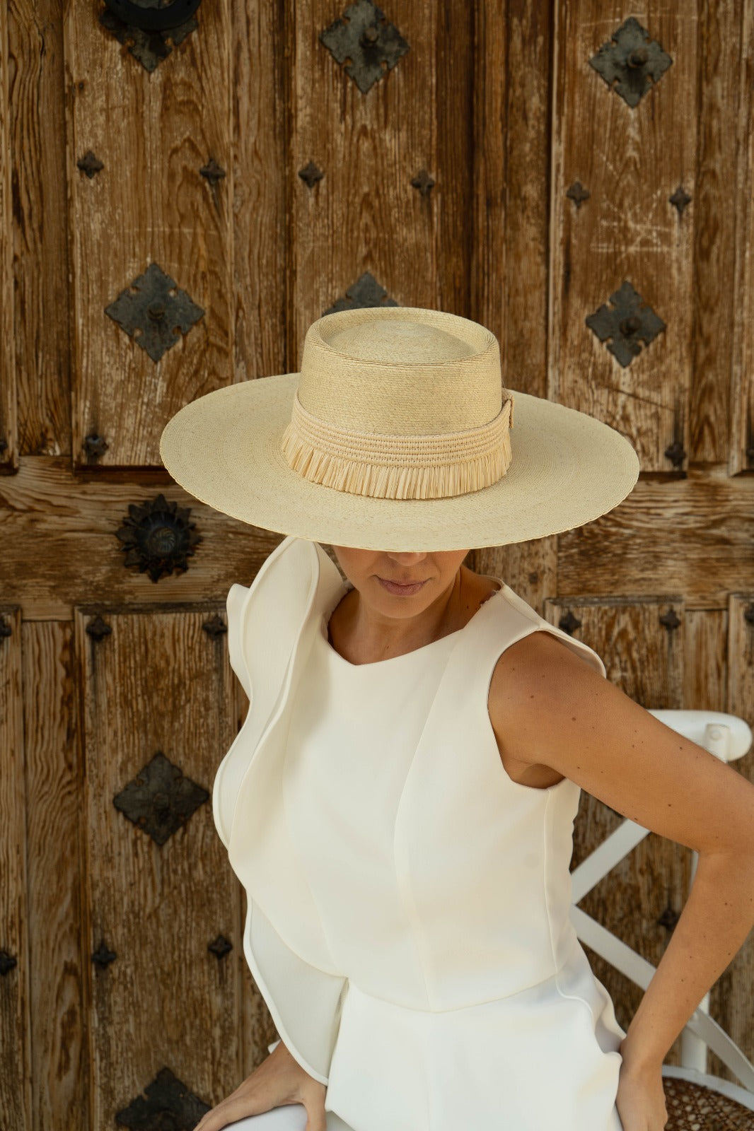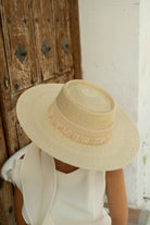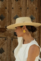 Sombrero canotier de paja trenzada confeccionado en España. Ala entre 10,5- 13 cm. aprox, altura de copa 5 cm. aprox. Diámetro total 44x42 cm aprox. En color natural.