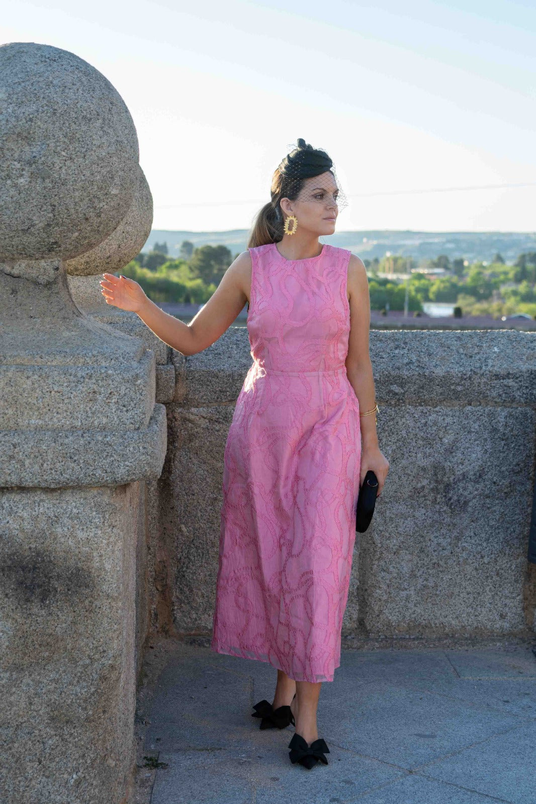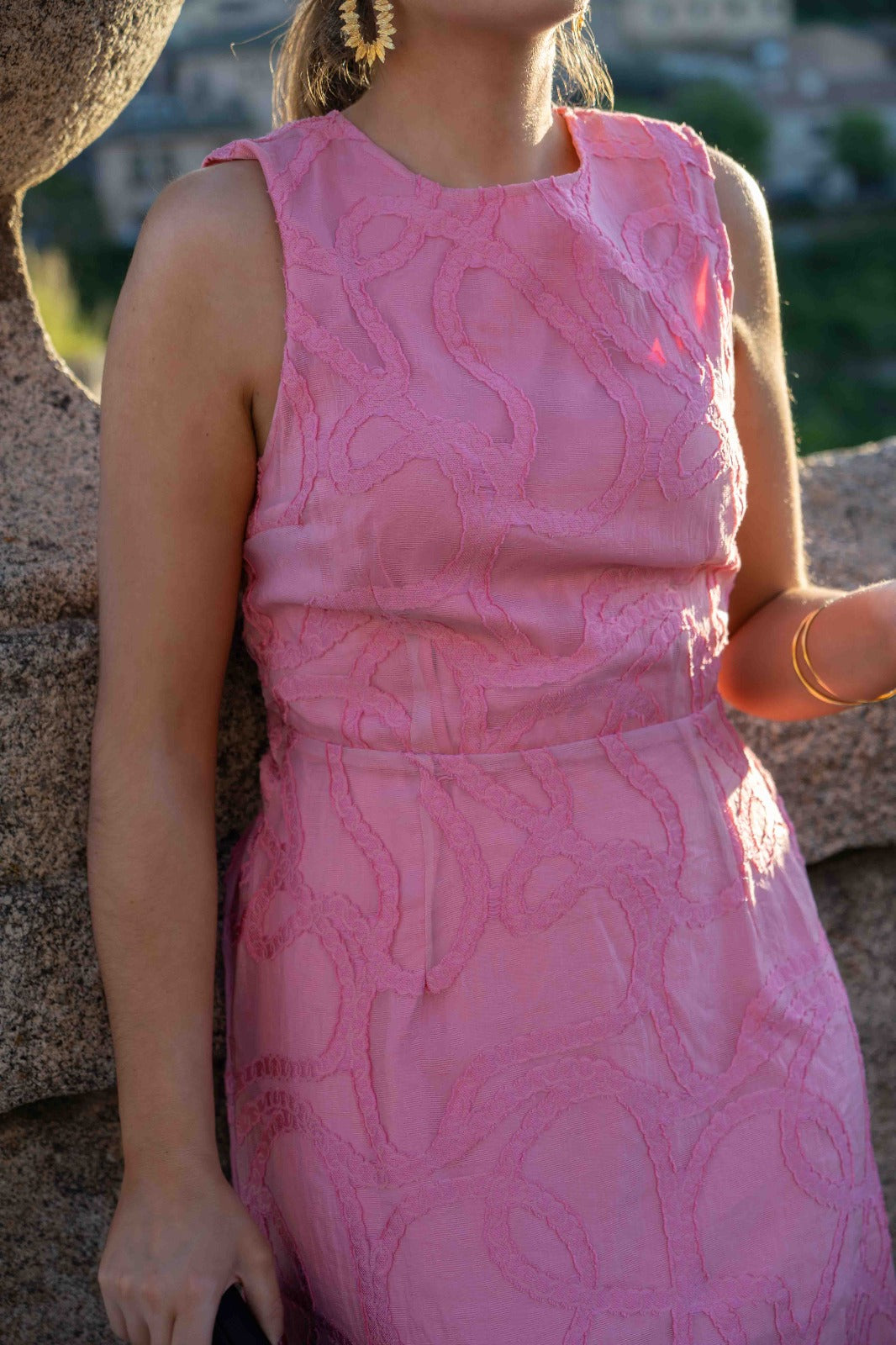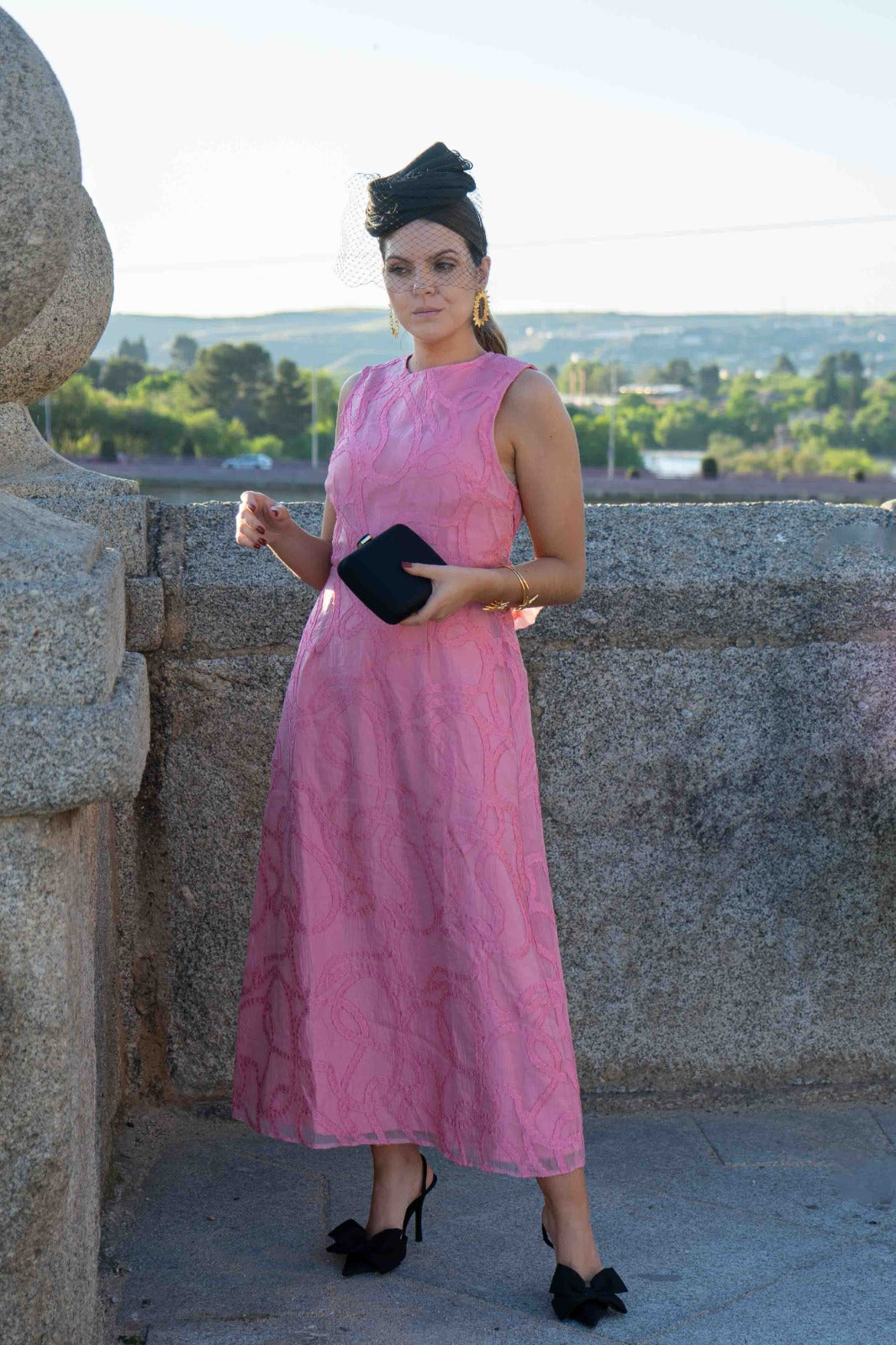 Vestido midi, escote redondo, espalada descubierta, lazo en cintura, corte evase. En color rosa.
