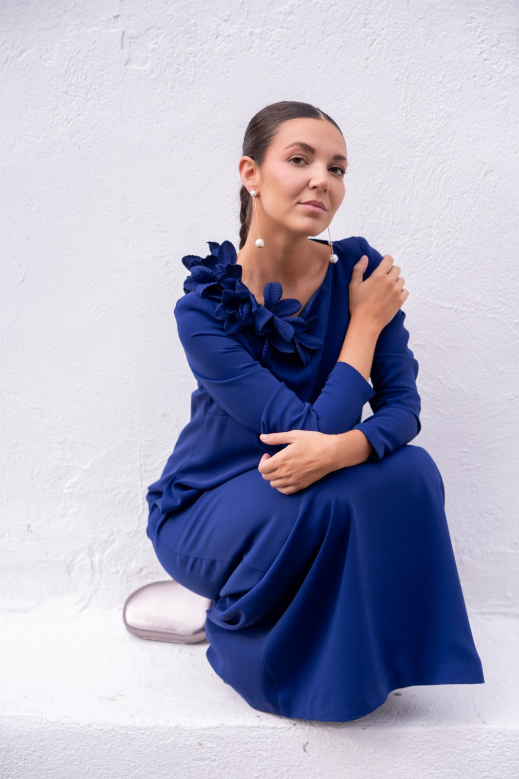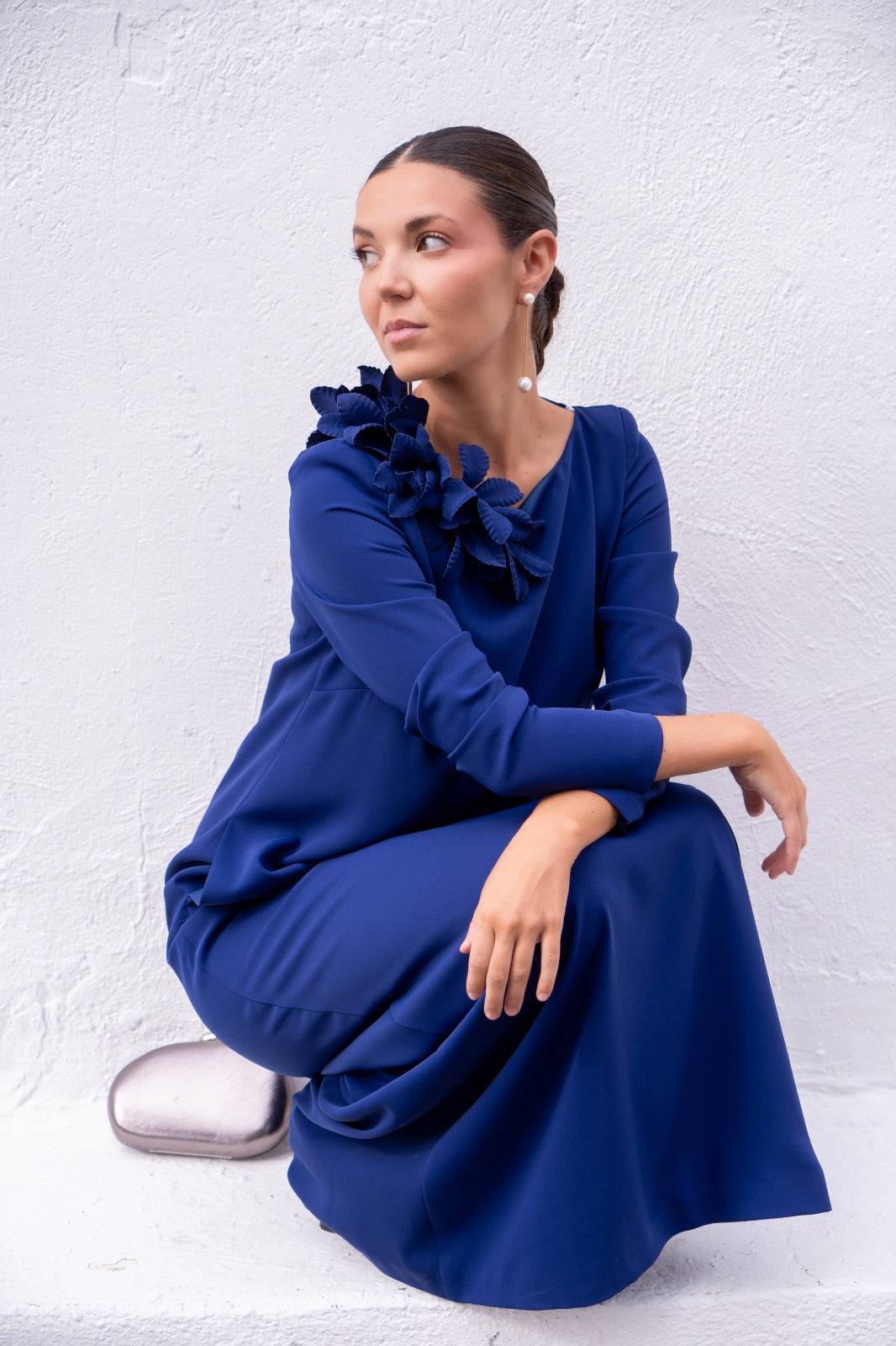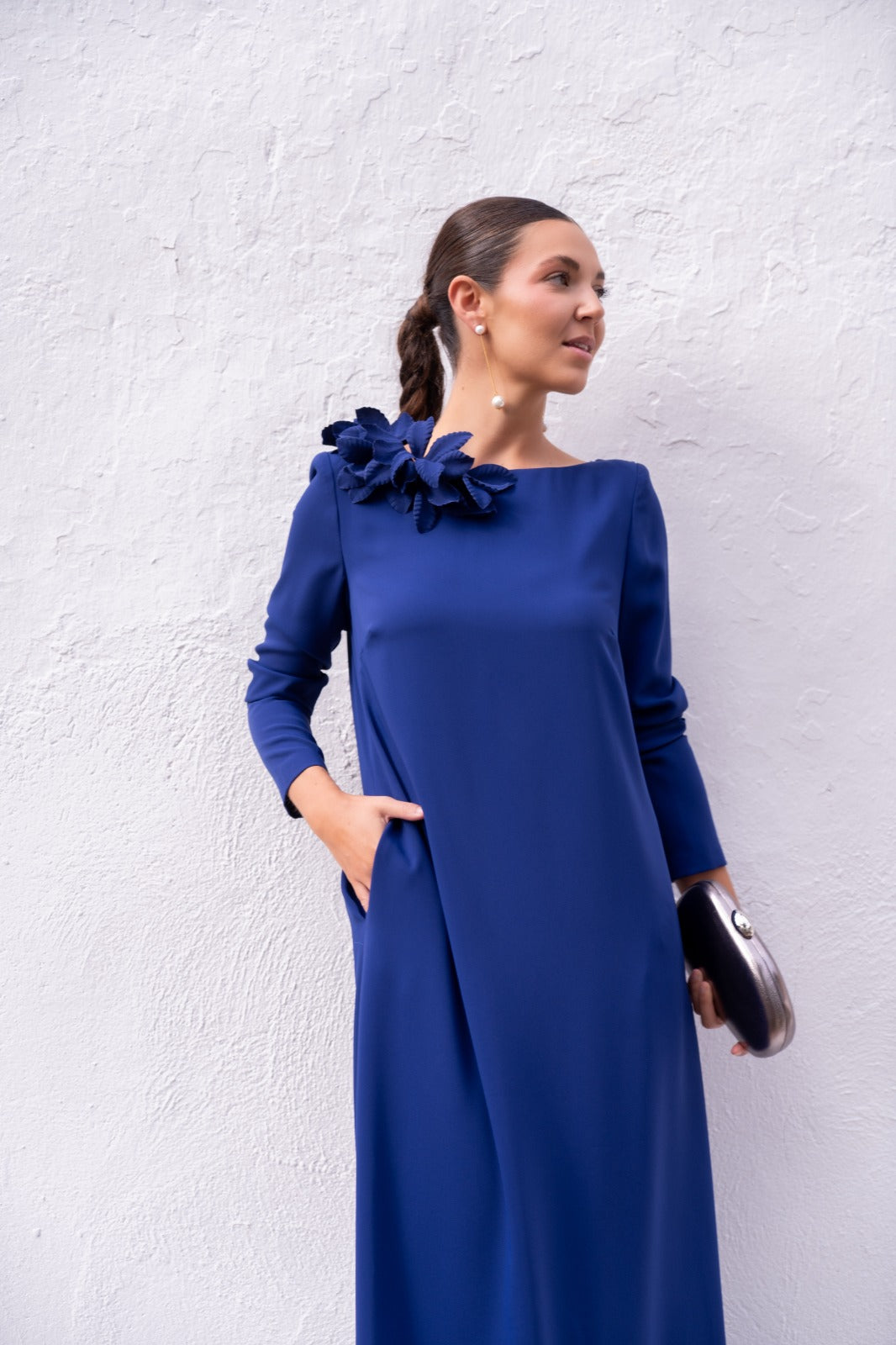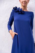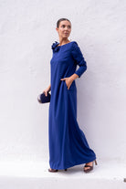 Vestido escote redondo, maga larga, recto, con caida. En color azul.
