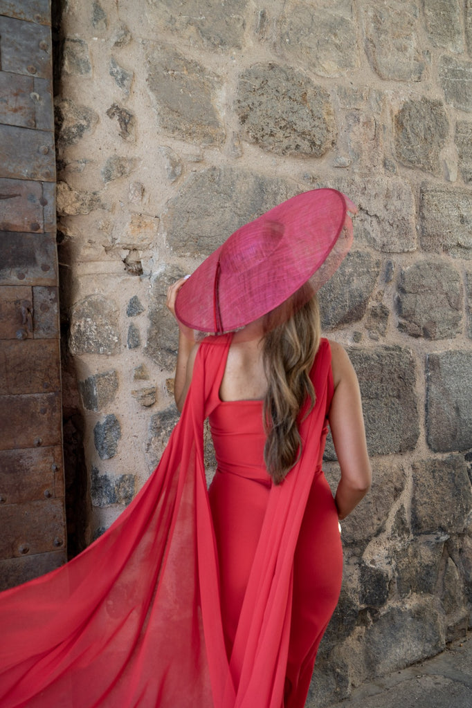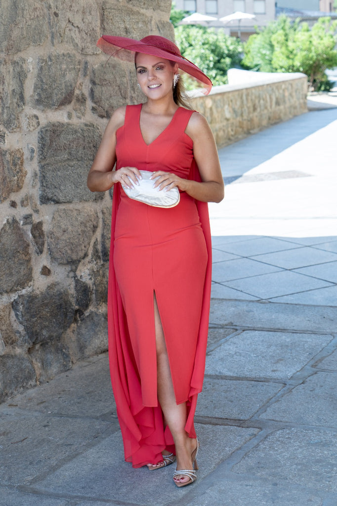 Vestido midi, escote delantero a pico, escote trasero cuadrado, gasa en el hombro, abertura delantera. En color rojo.