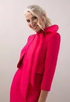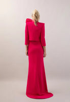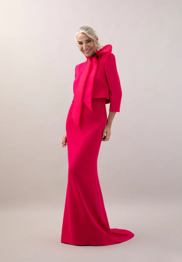 Vestido realizado en crepé con escote barco y manga francesa. Corte en la cintura con falda sirena. Chaqueta realizada en crepé con manga francesa y abertura en el centro. Escote con tirilla en organza de seda que cierra con una lazada.