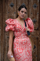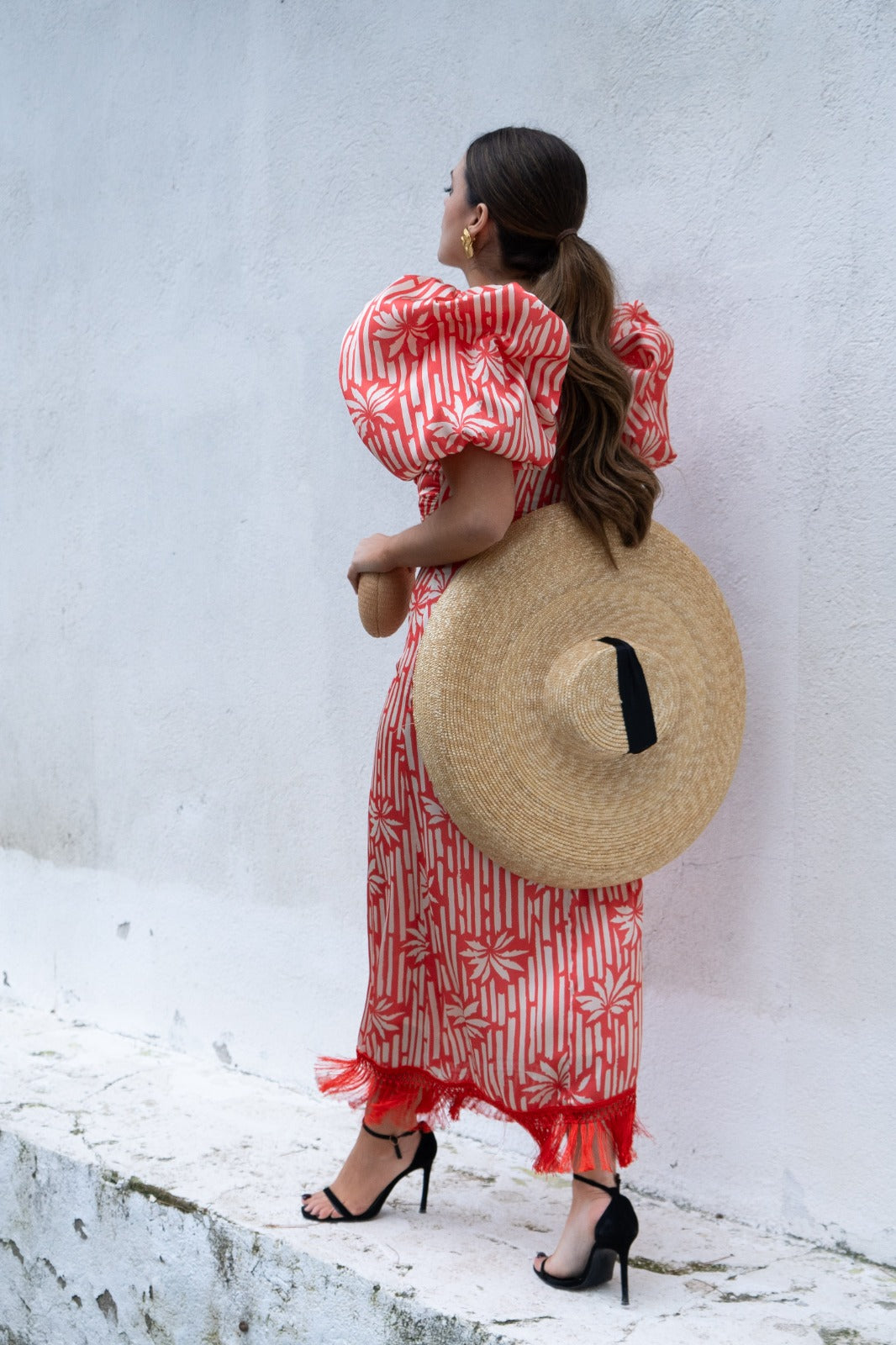 Vestido escote a pico terminado en nudo, manga corta abullonada, detalle flecos en el bajo. Bicolor estampado beige y naranja.