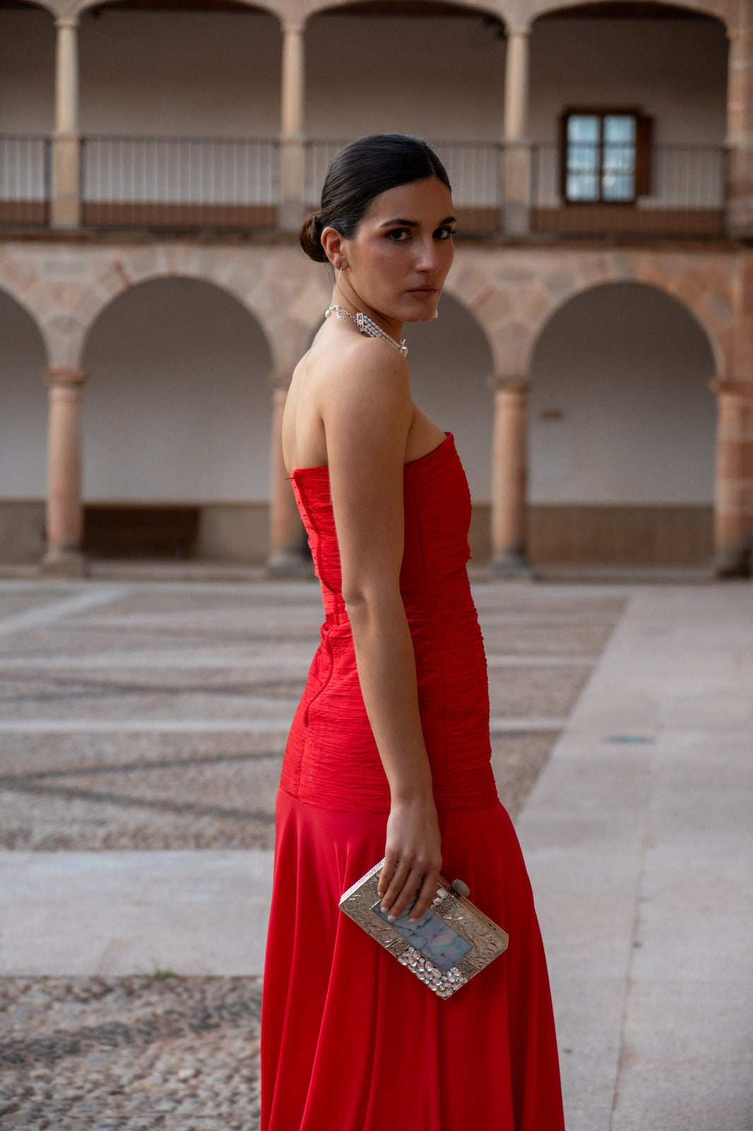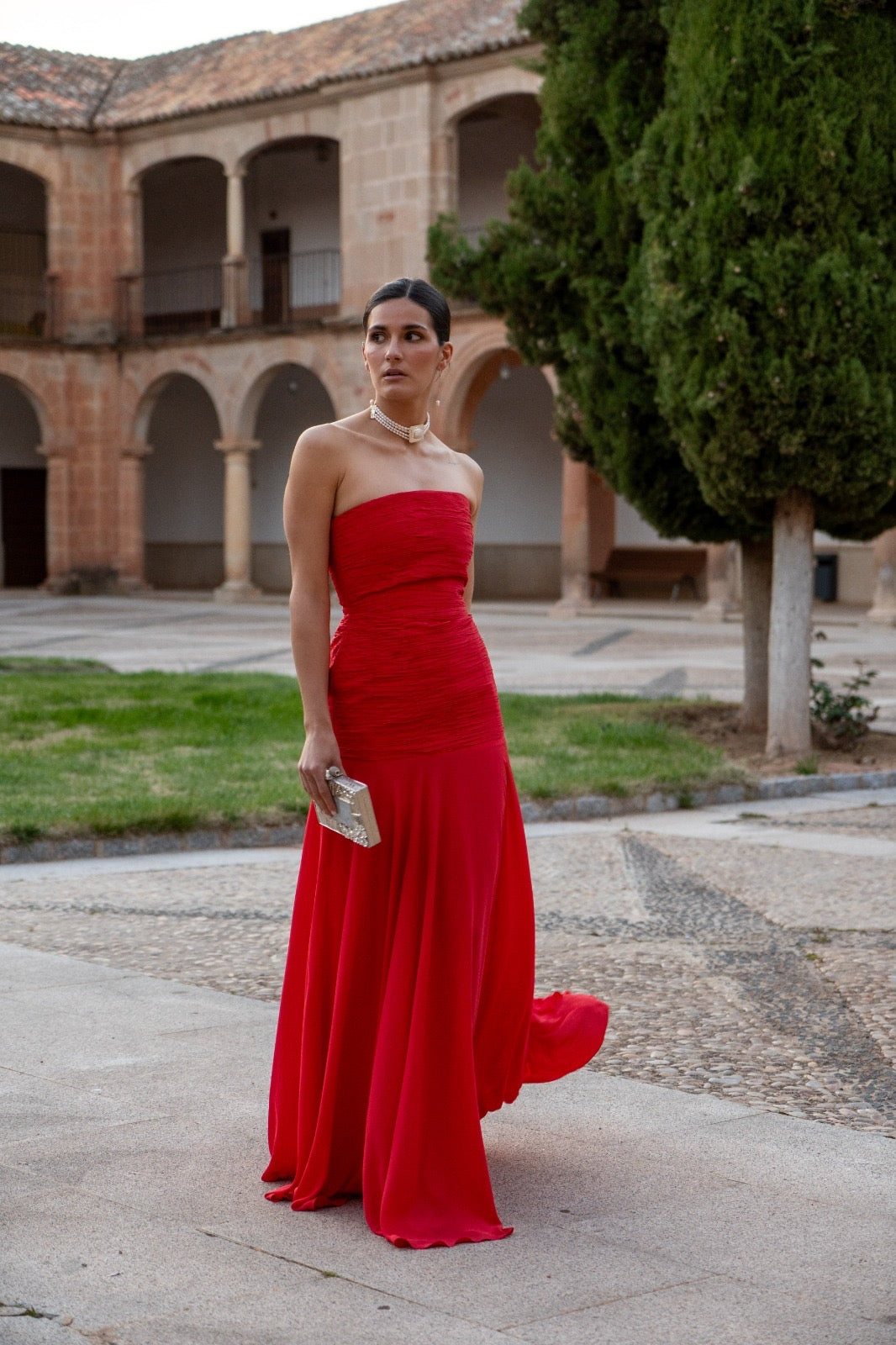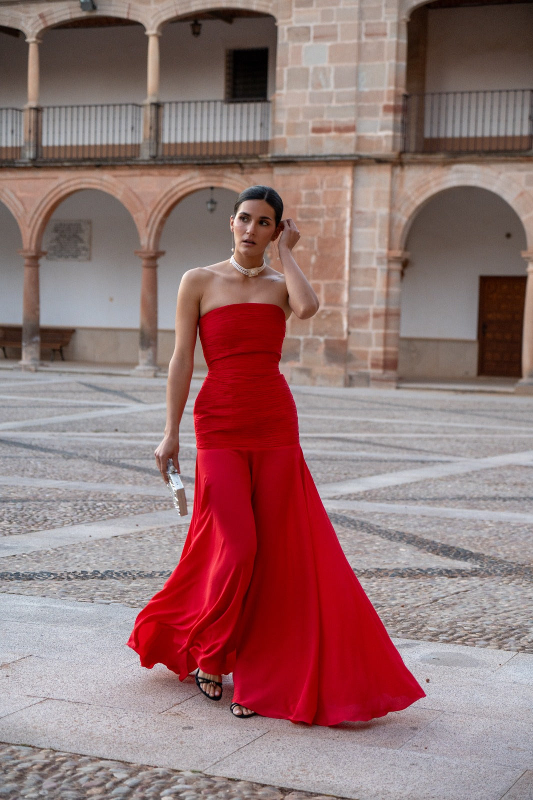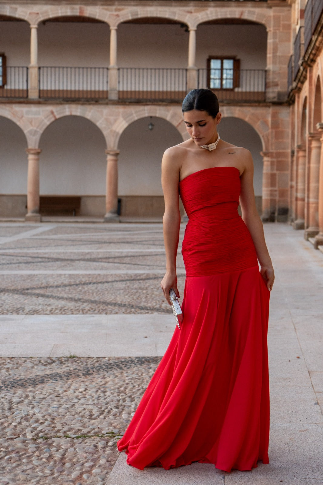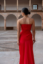 Vestido largo, palabra de honor con cuerpo totalmente drapeado a mano en tafeta de seda. Corte bajo la cadera con falda de capa en un ligero crepé. En color rojo.