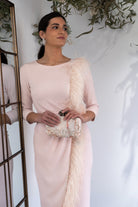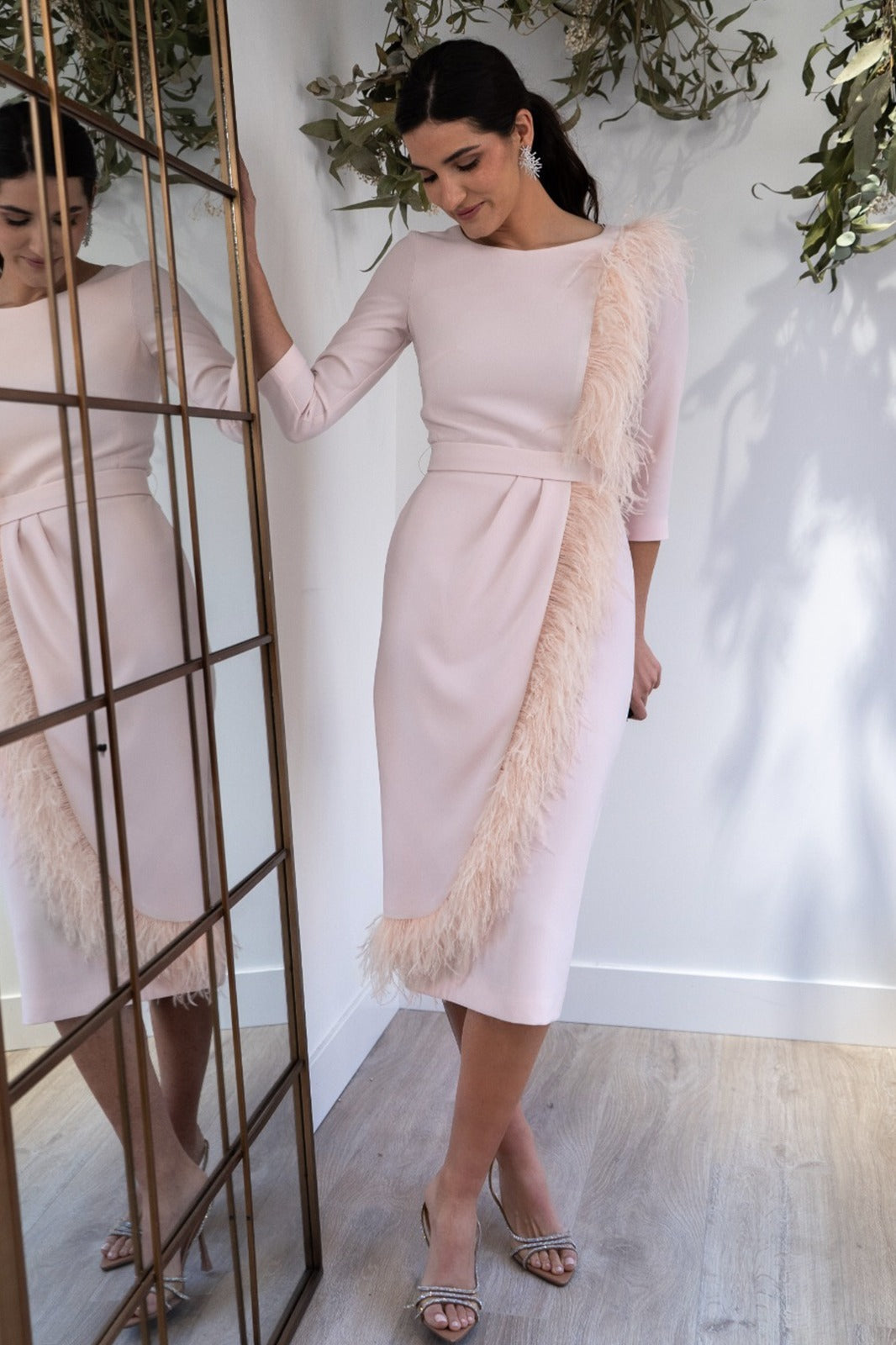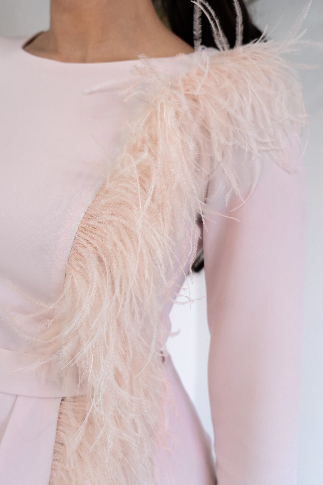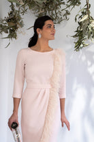 Vestido midi, escote redondo, manga francesa, corte en cintura con fajín, detalle plumas de hombro al bajo con detalle plumas. En color rosa.