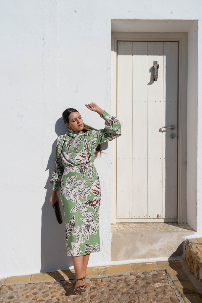 Vestido midi, cuello halter con nudo en un lado, manga larga con goma en el puño, abertura trasera. En color verde con estampado.