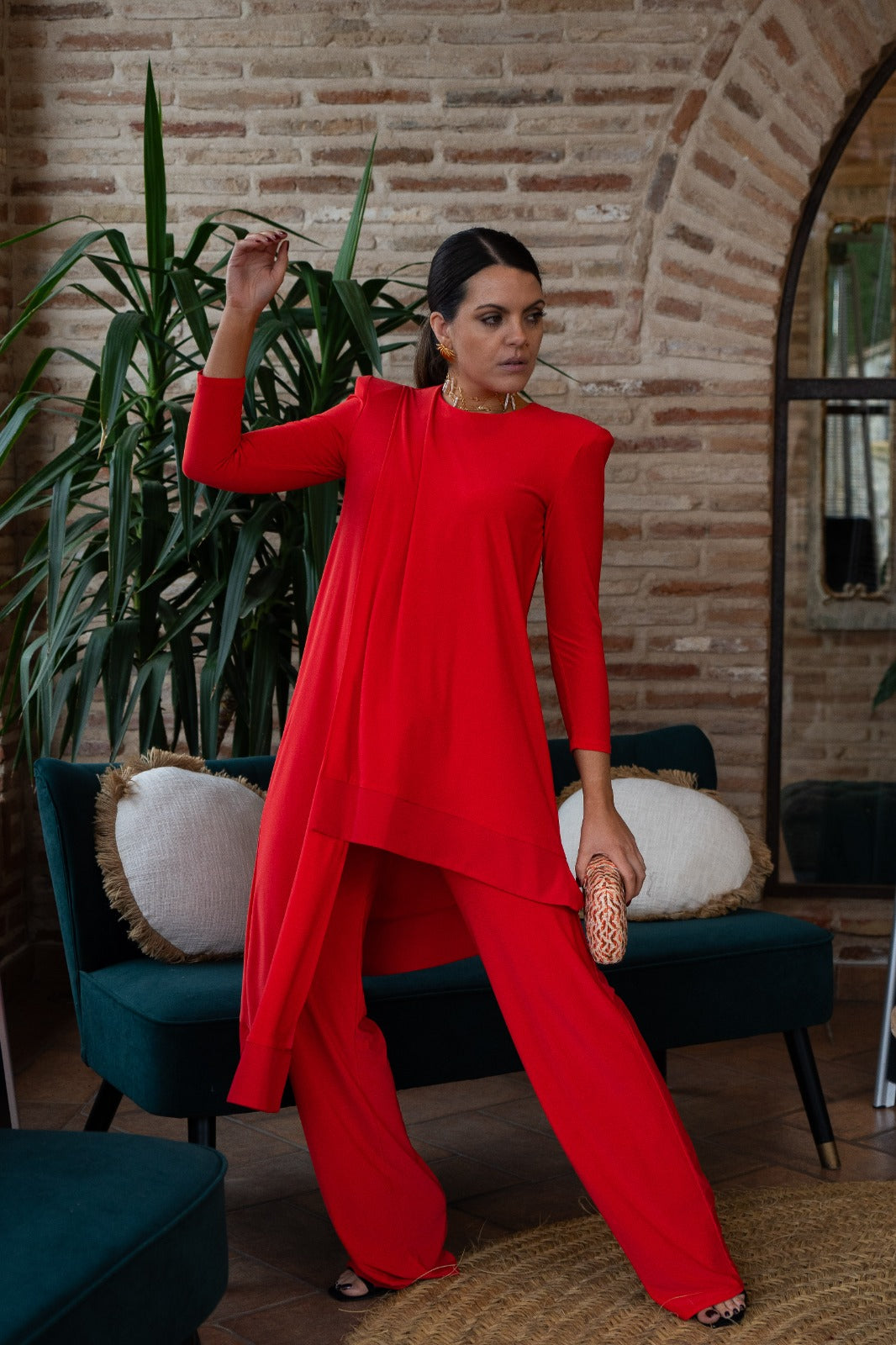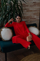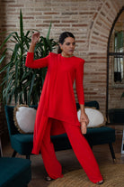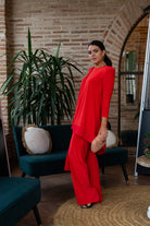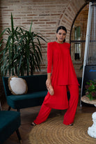Conjunto compuesto por casaca escote redondo, manga larga, asimetrica y pantalon ancho, con cintura engomada. En color naranja.