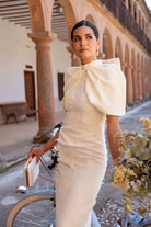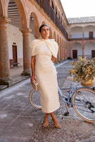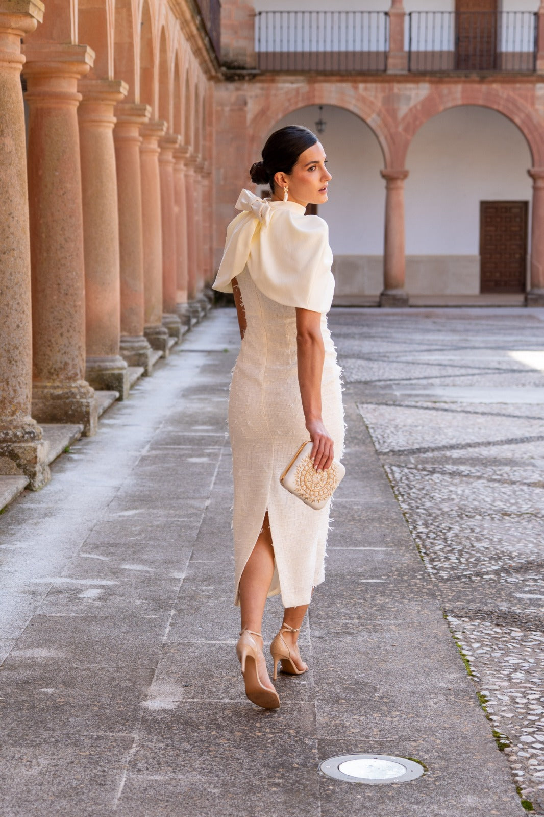 Vestido midi, escote redondo, sin mangas, recto, abertura trasera, capa estructurada con lazo, se puede quitar. En color beige.
