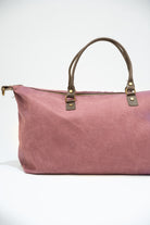 Canvas bag/suitcase with fixed leather handles and a removable, adjustable chocolate brown cotton strap. Features a zip closure, black lining, and an interior pocket. Aubergine color.