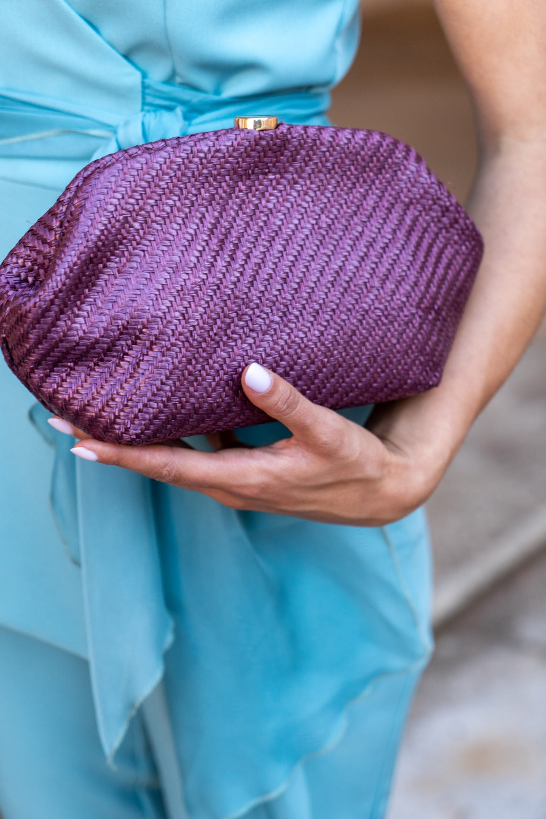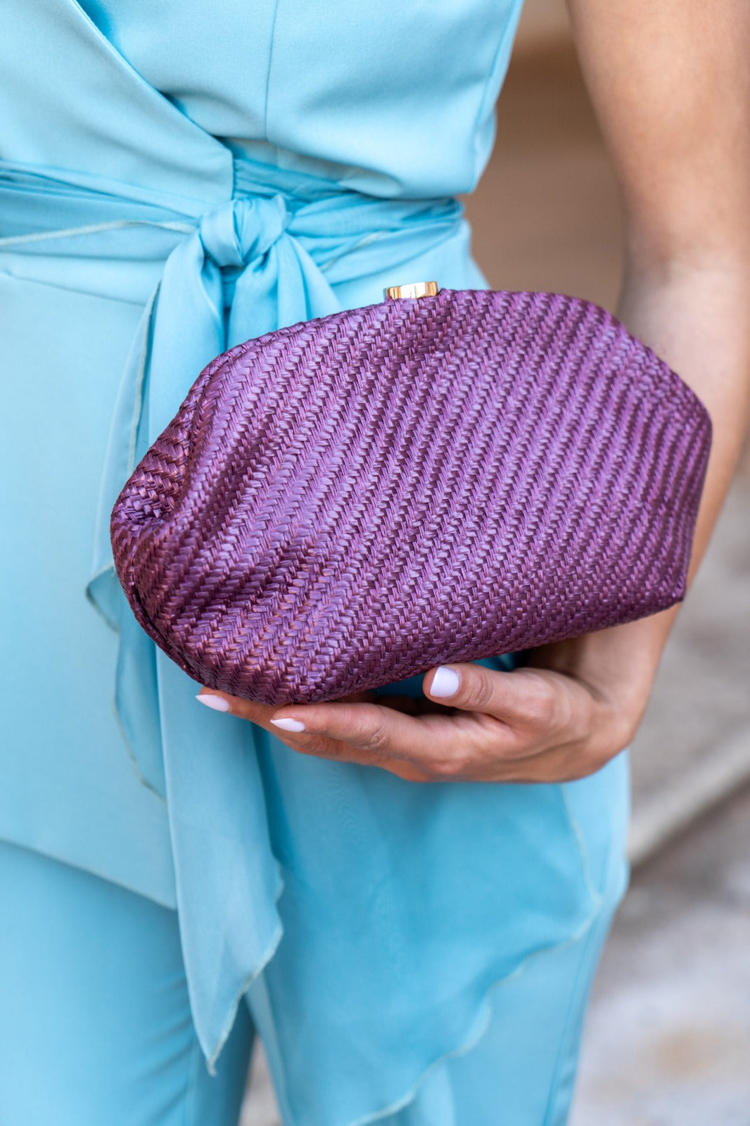 Rattan-style fabric bag, magnetic closure, gold chain to hang. In purple.