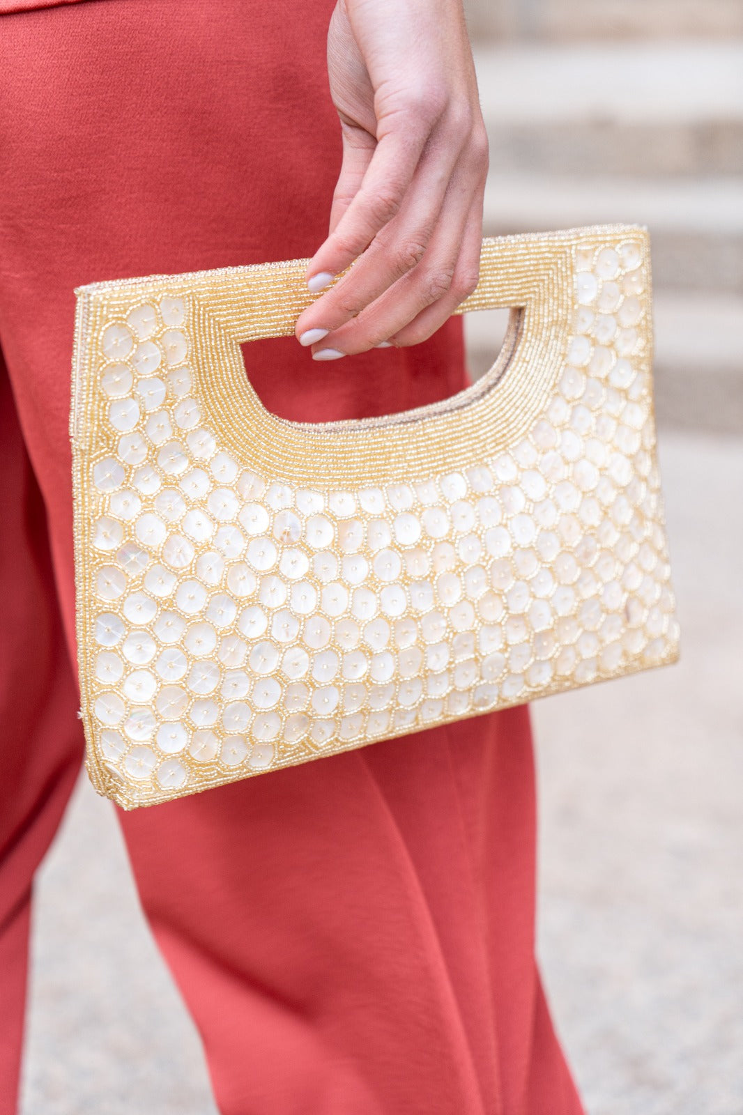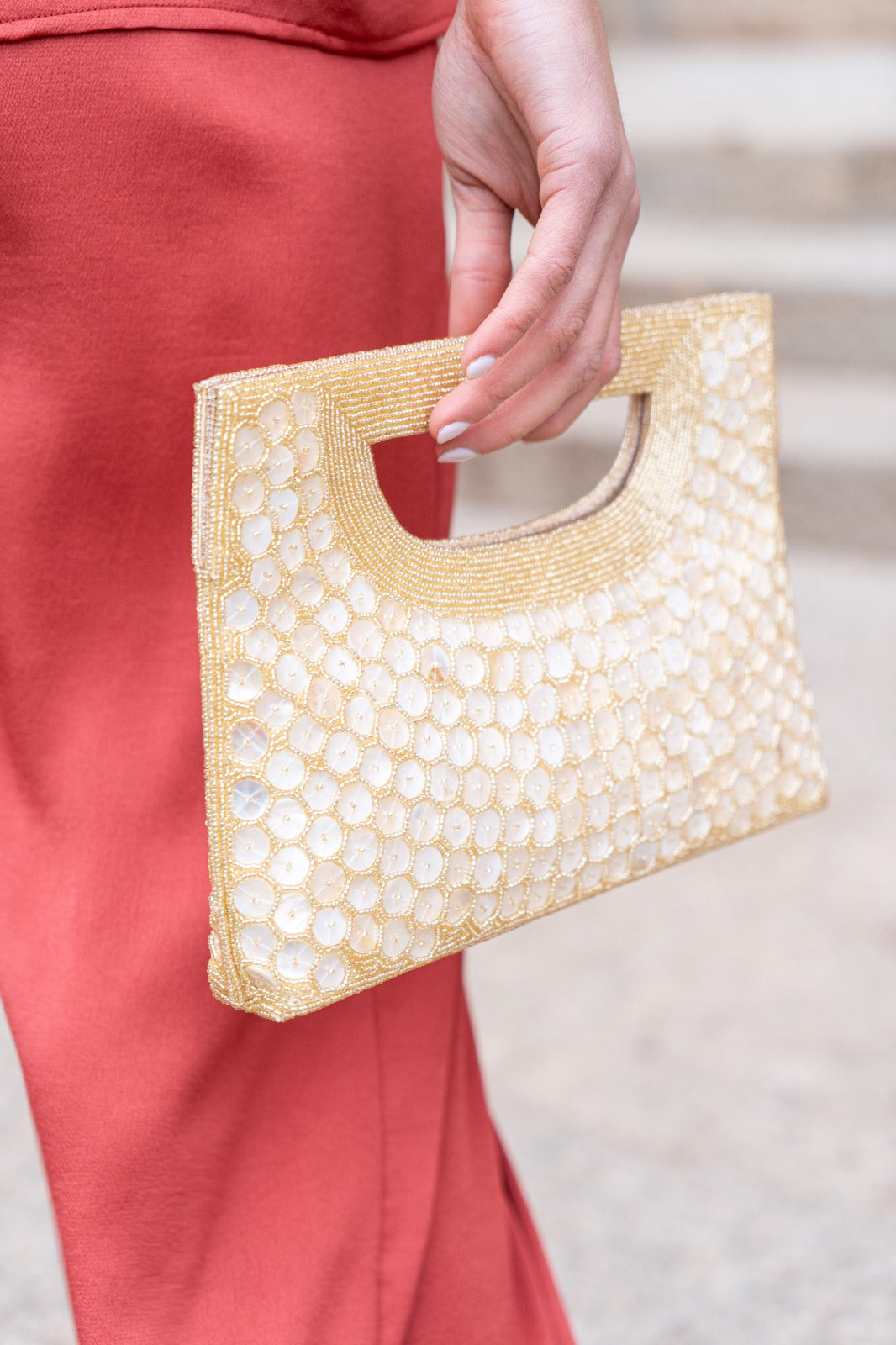 Bolso alargado, envuelto en nacar, efecto brillante y asa.