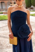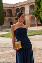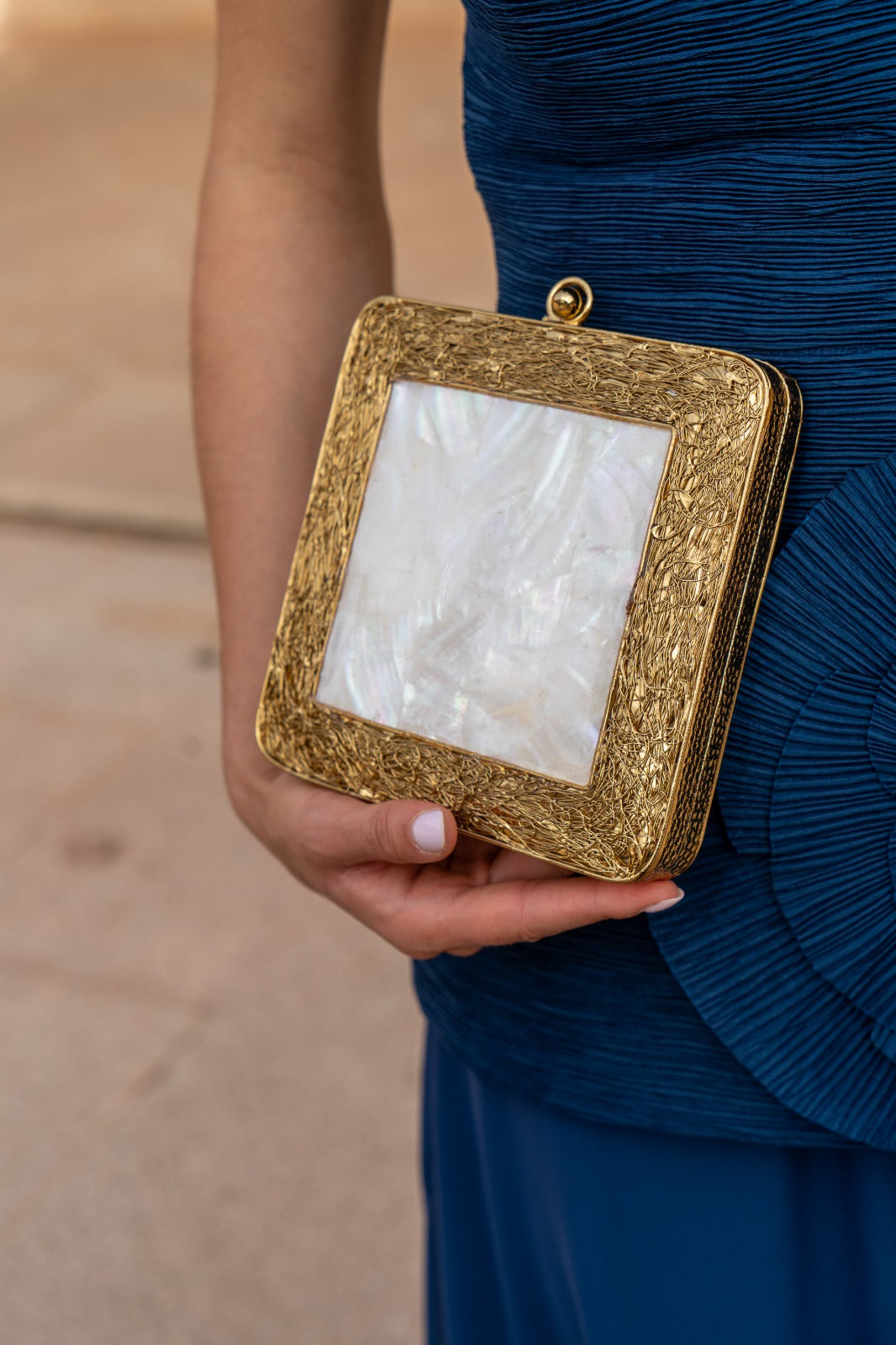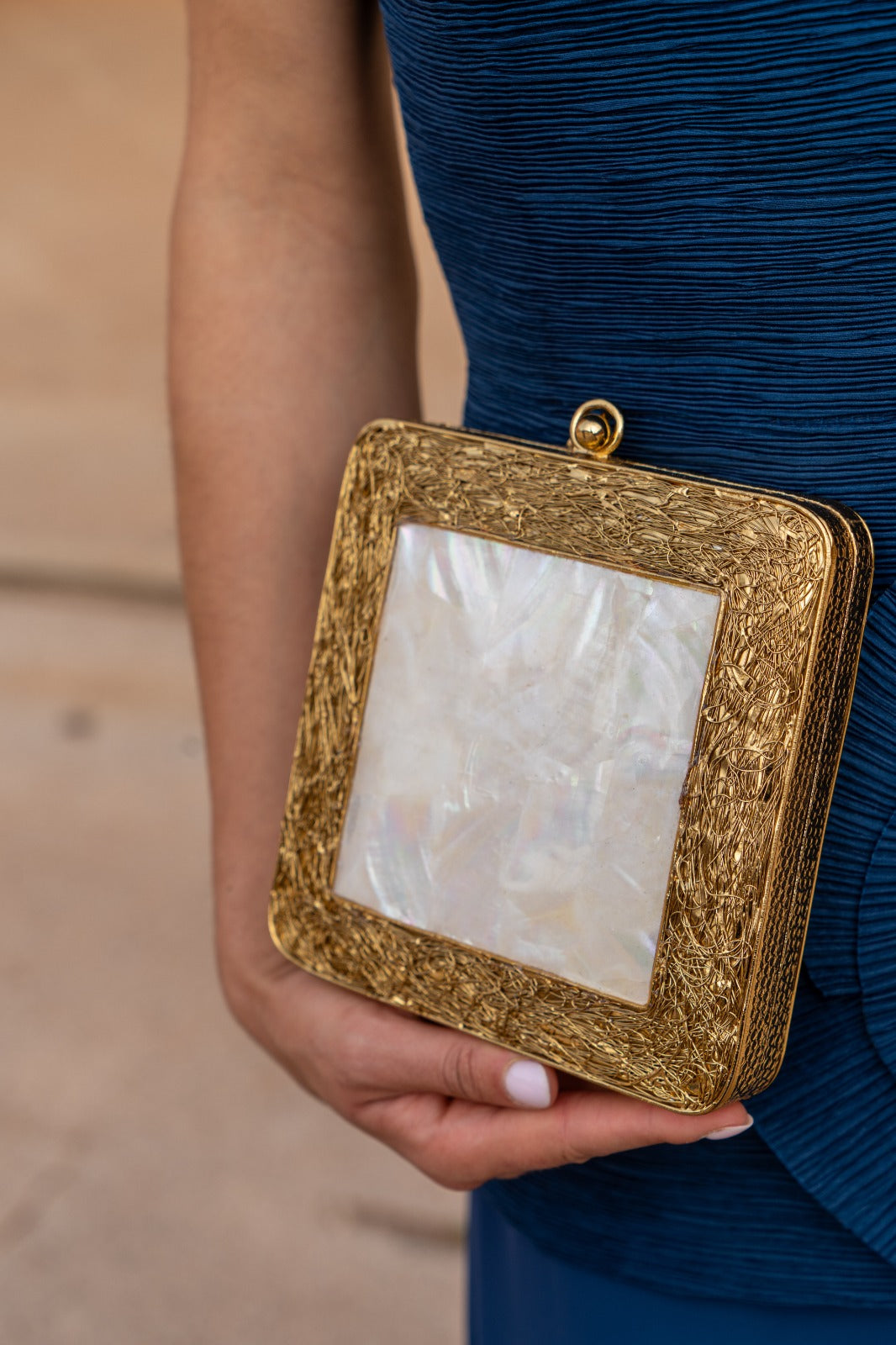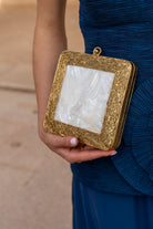 Square handbag, with gold engraving on one side and mother-of-pearl on the other, with a chain for hanging. In gold color.