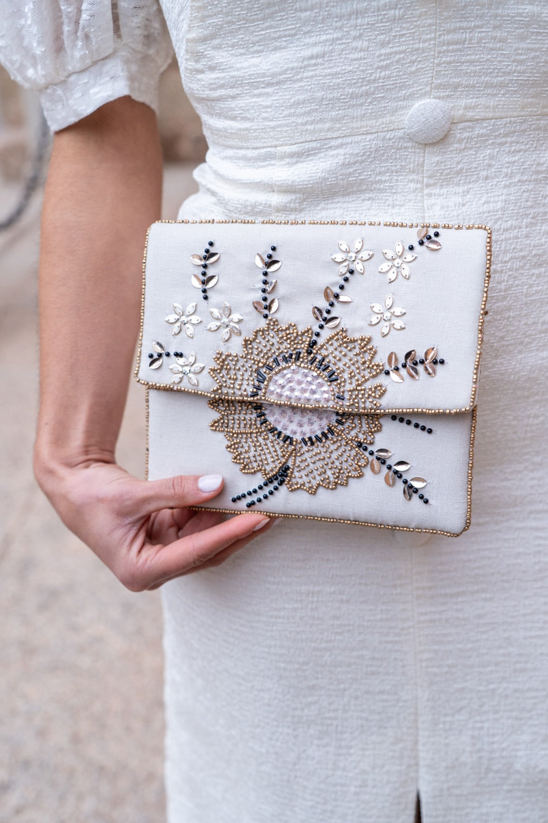 Bolso sobre joya hecho de manera artesanal, cuenta con cadena para llevarlo.