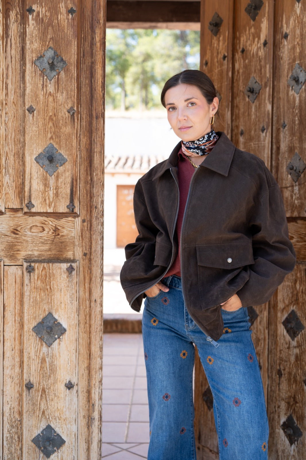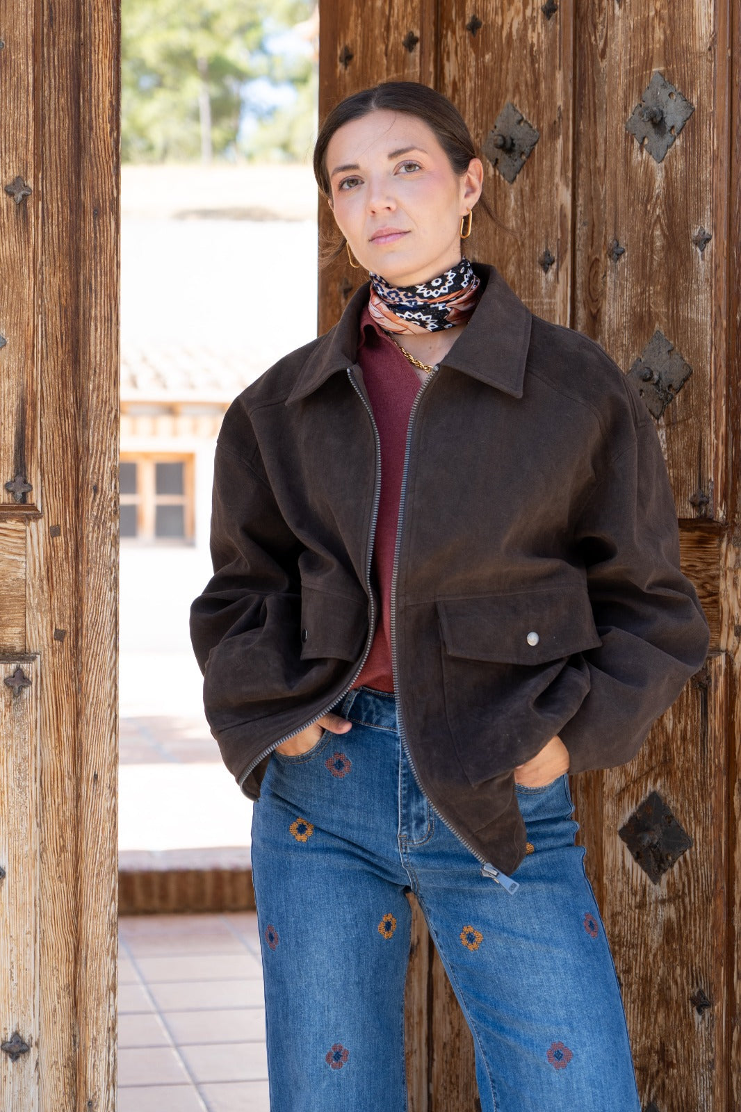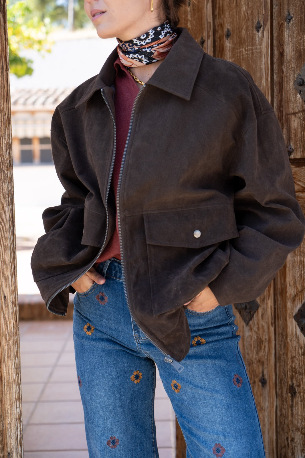 Brown leather jacket, lapel collar, zipper, front pockets, elastic at the back.