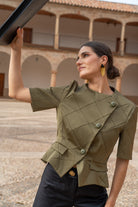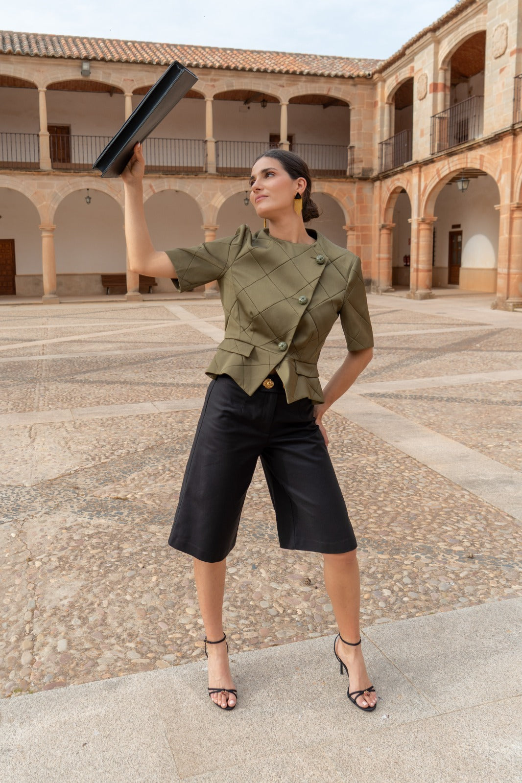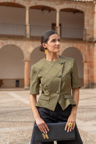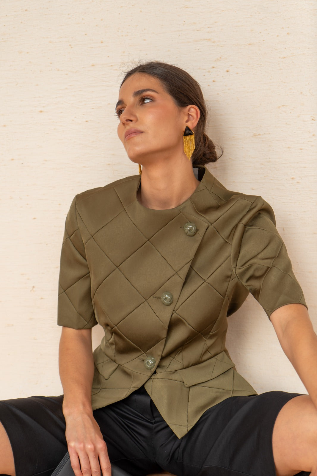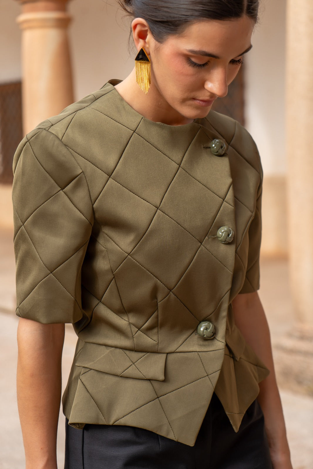 Short quilted jacket, geometric pattern, short sleeves, round neck, front button closure. In green.