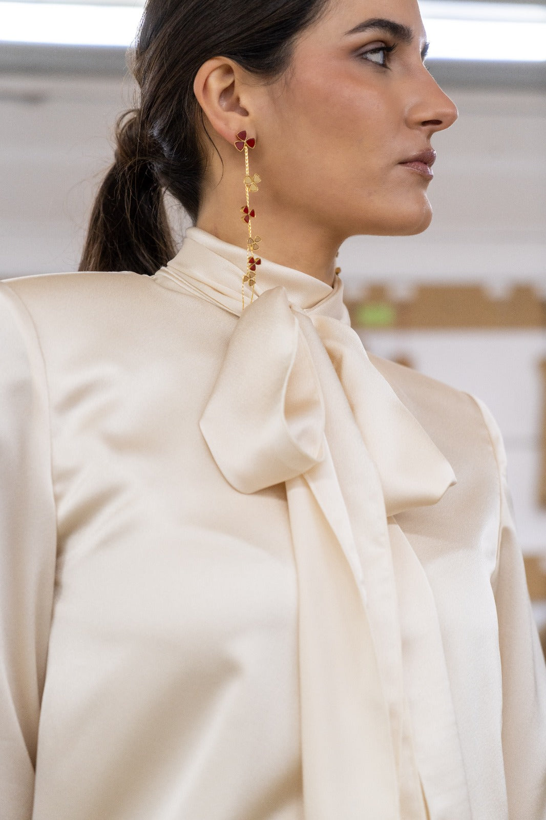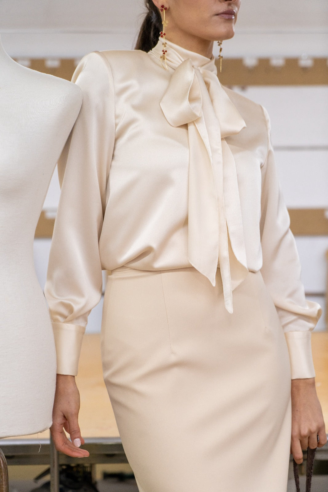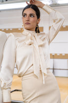 Set consisting of a satin top with a stand-up collar that closes at the back, structured shoulders, and a straight skirt with a waistband and a sparkly detail at the hem. In ivory.