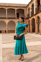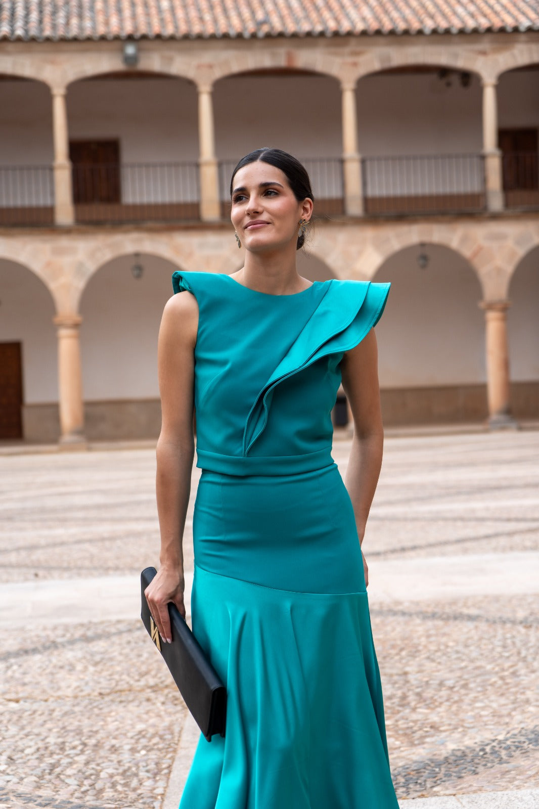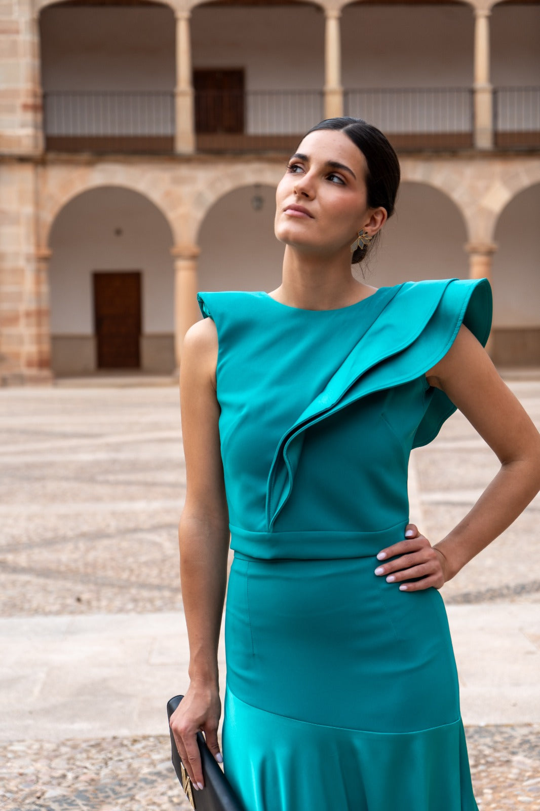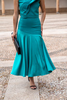 Set consisting of a round-neck, sleeveless top with a ruffle on one side, and a slim skirt with a flare at the bottom. In a combination of green fabrics.