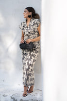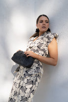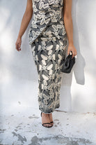Set featuring a vest with a crossover neckline, high shoulder padding, and a high-waisted skirt with a slit in the back. In black with beige crochet.