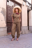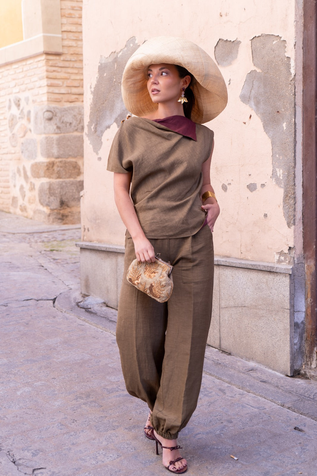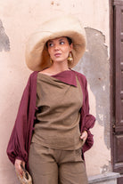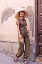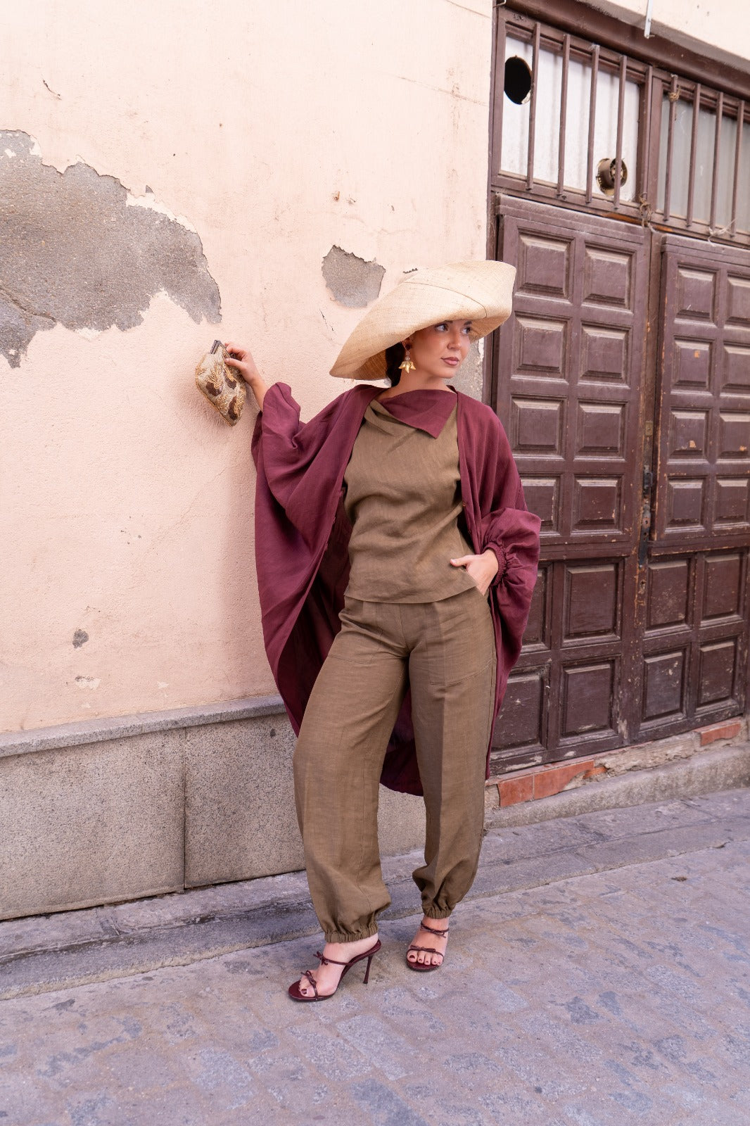 Set consisting of a sleeveless top with a two-tone turned neckline and trousers with an elasticated waist, baggy fit, and side pockets. In green and burgundy.