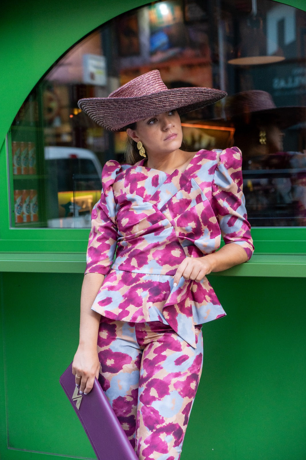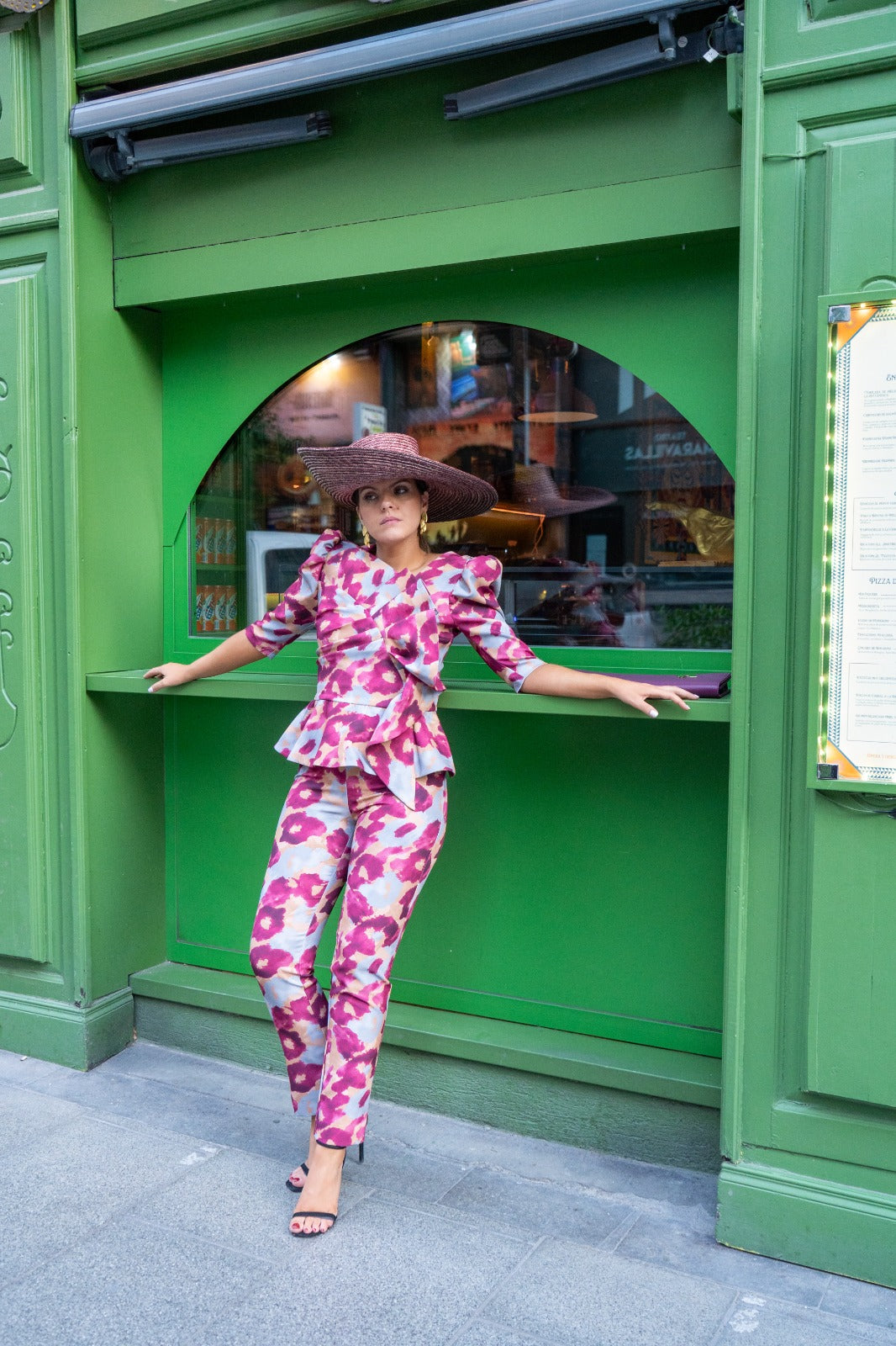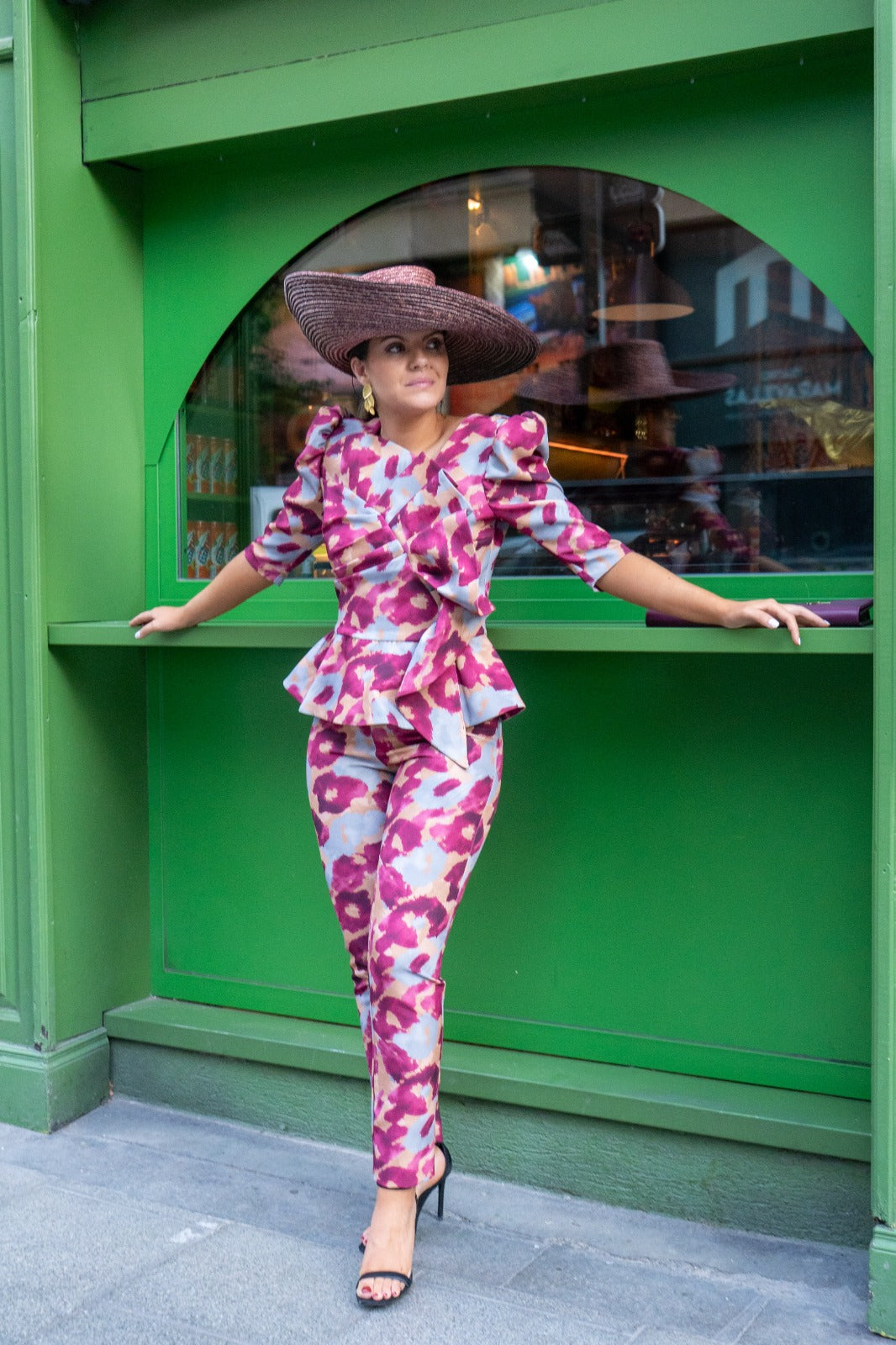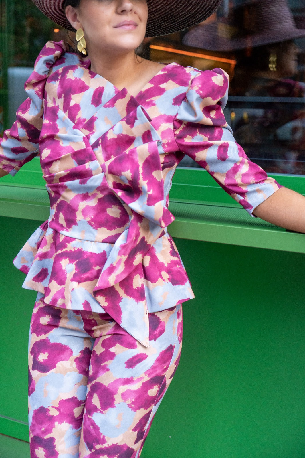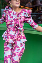 Set featuring a round-neck top with French sleeves, a bow at the front, a ruffle at the bottom, and high-waisted, narrow pants with a back zipper. Printed color.