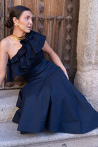 Set consisting of an asymmetric top with a maxi ruffle and a fitted skirt that flares out at the bottom. In navy blue.