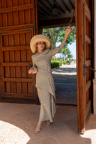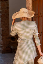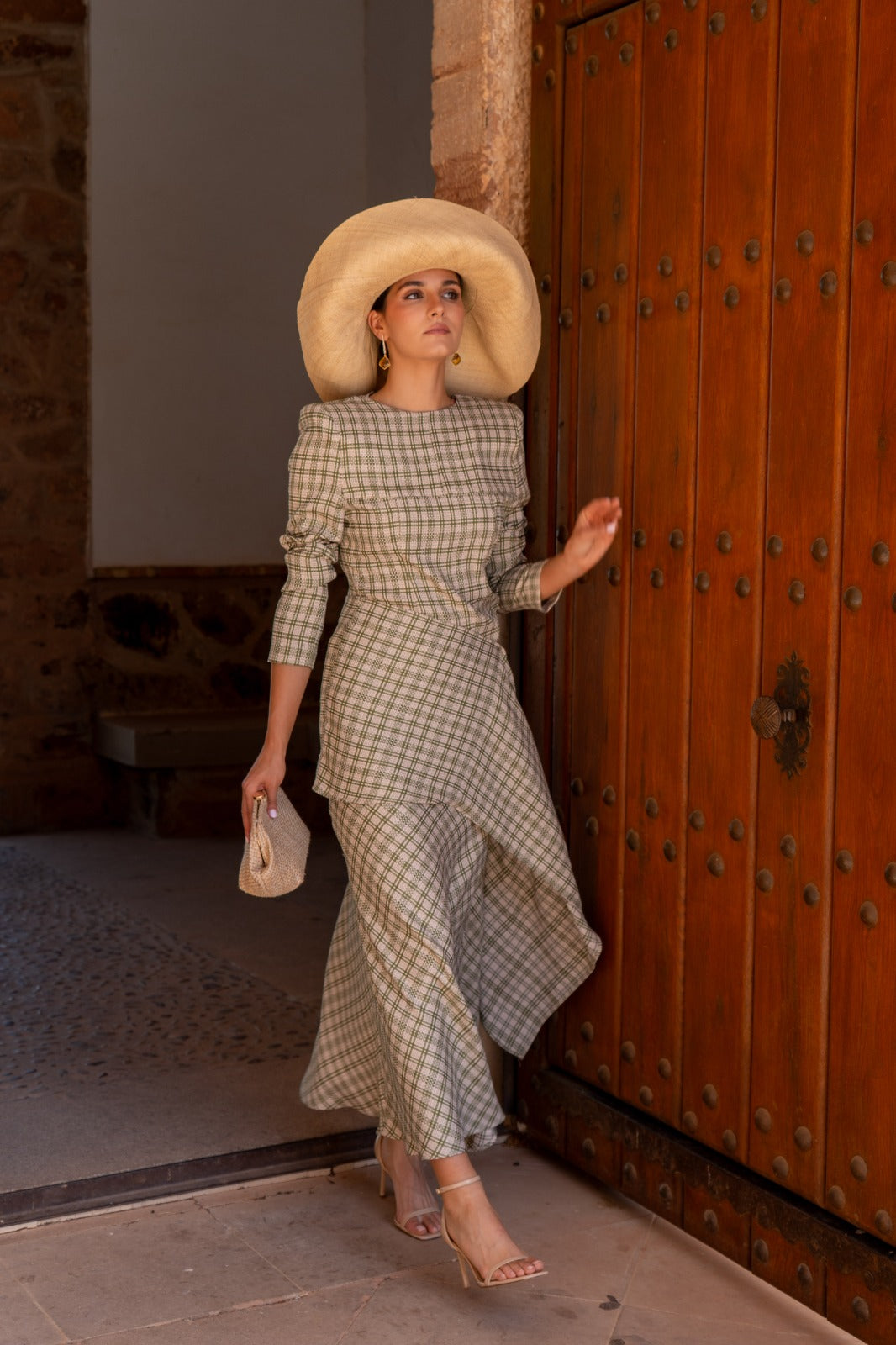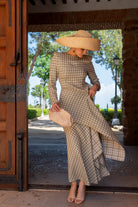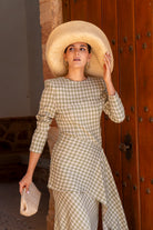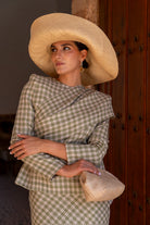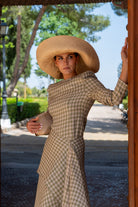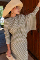 Set consisting of a high-neck top, long sleeves, fitted and asymmetrically draped. High-waisted, A-line skirt. In neutral plaid.